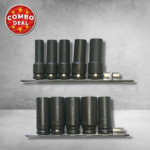 This Jimy Tools 10 Piece Deep Impact Socket Set is made from CrMo trade quality steel with high tensile strength to ensure that you can tackle even the toughest nuts and bolts. This 10-piece set comes with two premium anodized socket rails to help keep you organized.