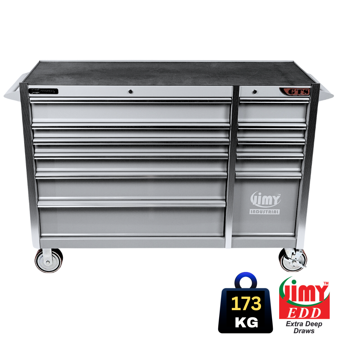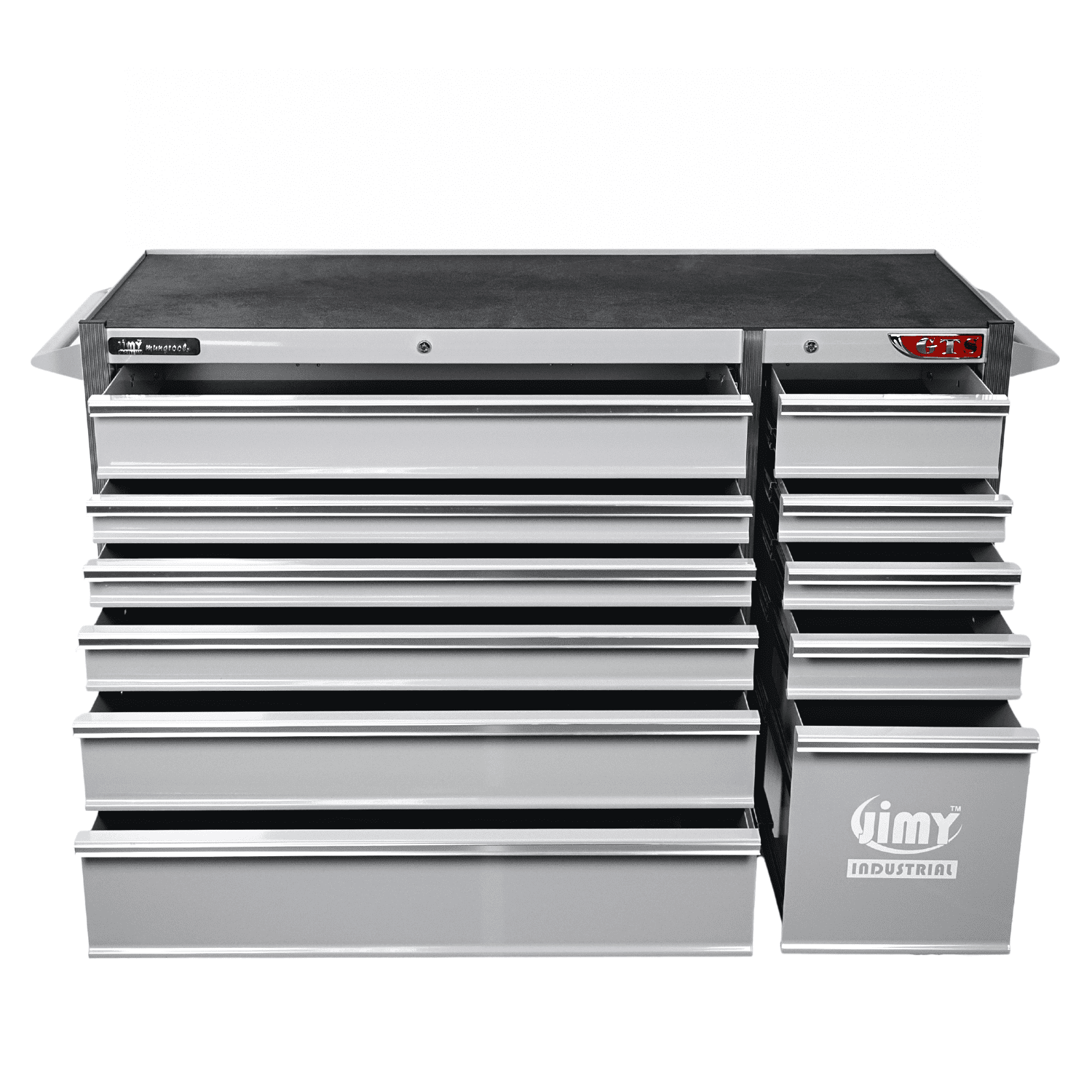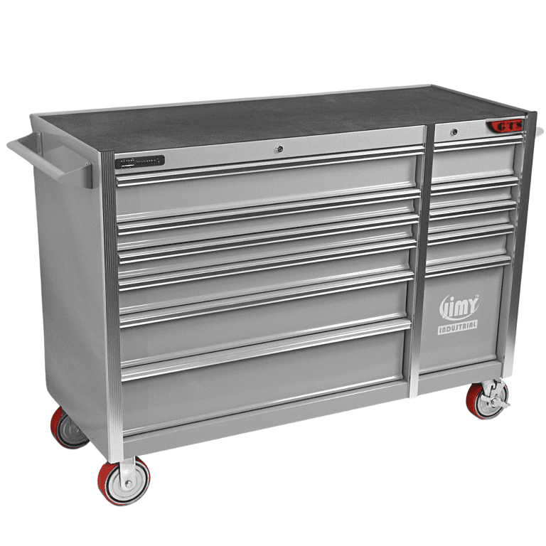 Jimy tool boxes are career spanning and built to last! Jimy tool boxes are fully modular to offer a number of storage combinations to fit your needs. With the extra deep 500mm drawers our 56” roller cabinet expands your storage capabilities and a massive 1250 kgs in weight load capacity. It features 11 drawers with full-width drawer handles, pre-cut drawer liners and a single integrated barrel lock. Durable full extension ball bearings and a tough power coated finish make this storage a perfect fit for your home garage or commercial workshop.