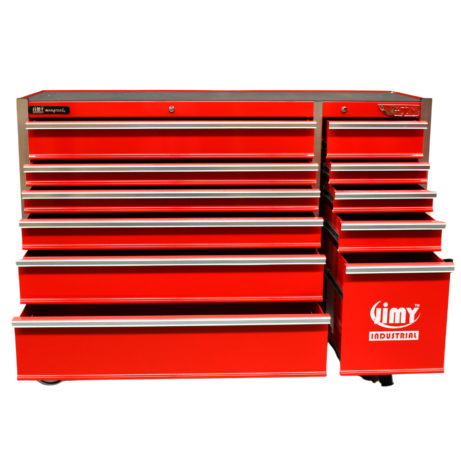 Jimy tool boxes are career spanning and built to last! Jimy tool boxes are fully modular to offer a number of storage combinations to fit your needs. With the extra deep 500mm drawers our 56” roller cabinet expands your storage capabilities and a massive 1250 kgs in weight load capacity. It features 11 drawers with full-width drawer handles, pre-cut drawer liners and a single integrated barrel lock. Durable full extension ball bearings and a tough power coated finish make this storage a perfect fit for your home garage or commercial workshop.