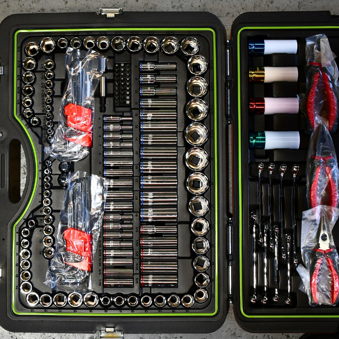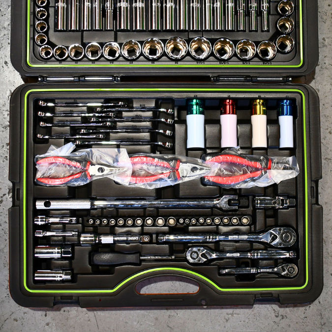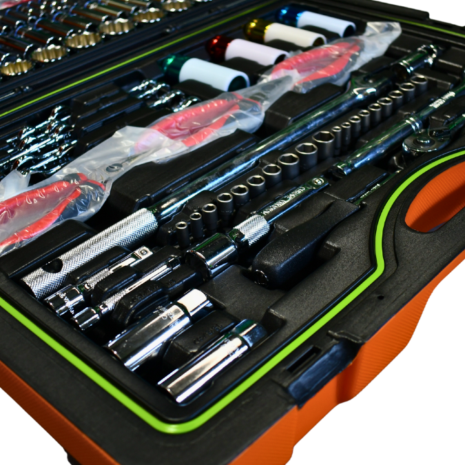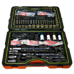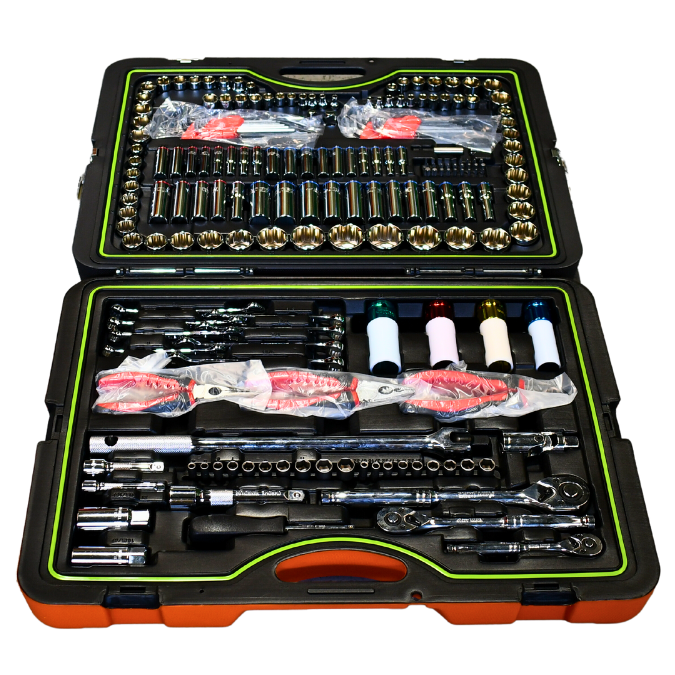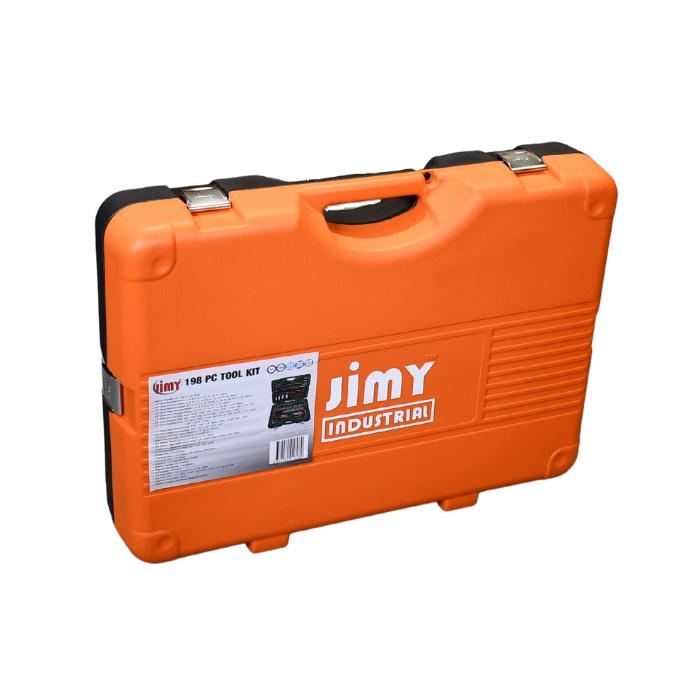 The Jimy Tools 198 piece combination socket set is ideal for the professional or home handyman alike featuring a large variety of sockets both standard and deep in 1/4”, 3/8” & 1/2” drive, 4 thin walled wheel nut sockets, a full range of socket accessories, ring open end spanners in both metric and imperial, hex keys in metric and imperial, pliers and bit sets all packed into a solid splash proof blow mould case. Ideal to keep in the car for that unforseen emergency or to form part of your home workshop tool kit, this very usable kit is backed by Jimy’s life time warranty and represents excellent value for money.