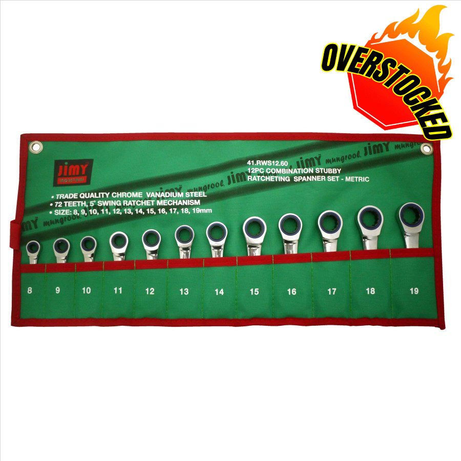 This Jimy Tools 12 Piece Stubby Ratcheting Spanner Set comes in the most common metric sizes ranging from 8mm up to 19mm. These spanners are half the length of normal spanners allowing you to get into some tight spaces.