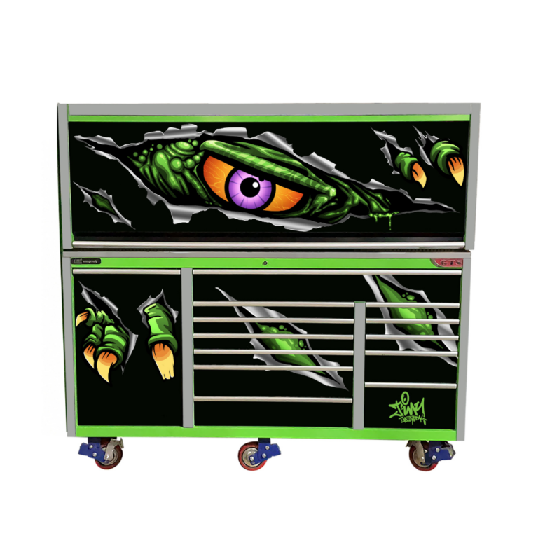 Step up your workshop with the Mutant Raptor Edition of the Jimy Tools 76? Dozer Workshop. This unit delivers the perfect balance of massive storage capacity, heavy-duty performance and bold graffiti artwork that sets it apart from standard tool storage.