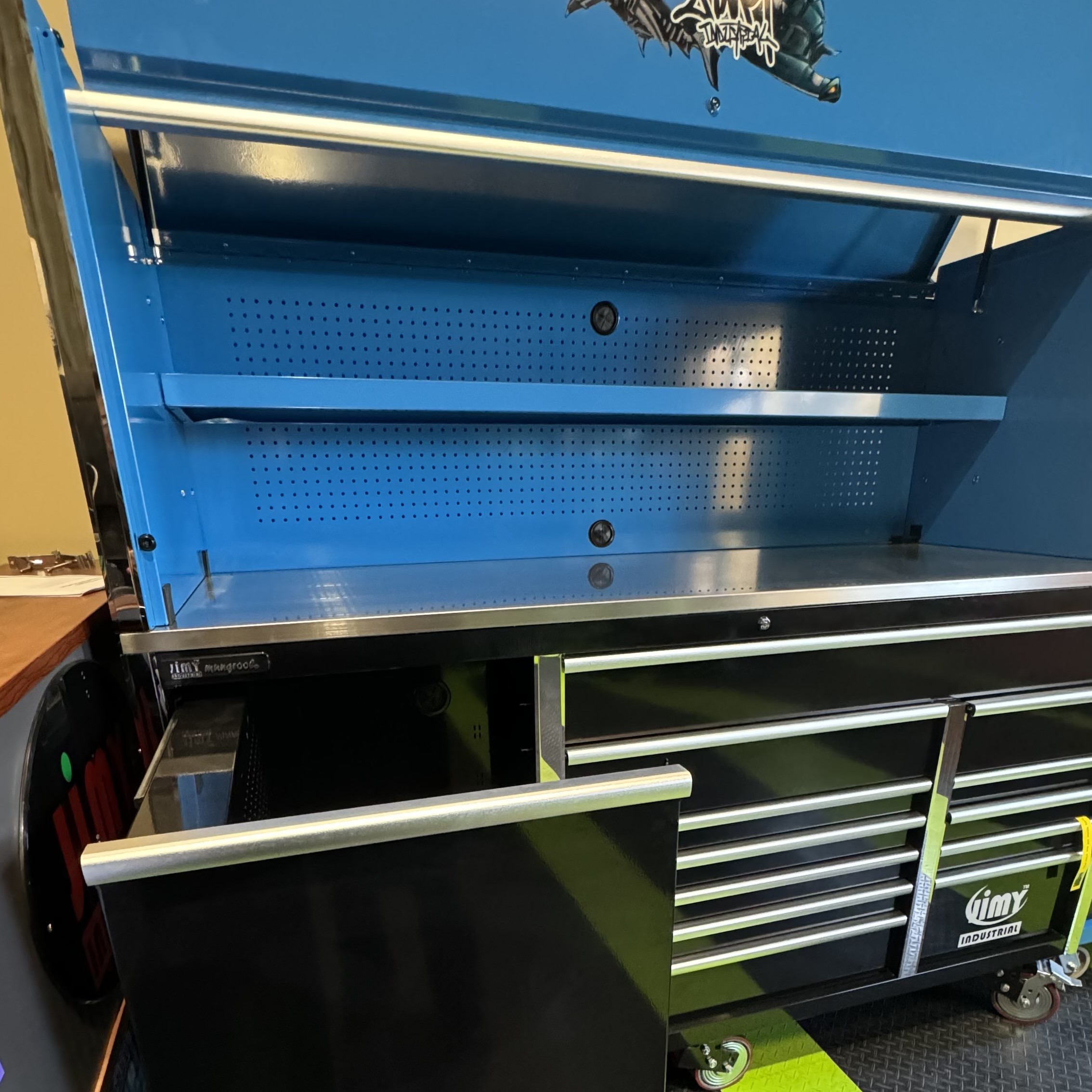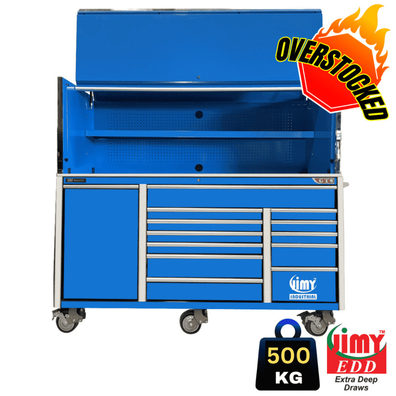 Jimy tool boxes are career spanning and built to last! Jimy’s Dozer Range is packed full of top of the line features such as profoundly deep 700mm drawers, lighting and power system, fully lockable hutch perfect for diagnostic tools, electrical equipment or bulky storage. Also a massive 2060 kgs in weight load capacity and including a heavy duty stainless steel workbench. 13 Drawers all with click lock drawer handles, pre-cut drawer liners, durable full extension ball bearing slides and a tough powder coated finish to make this monster storage unit perfect for your privileged home garage or more common commercial workshop.