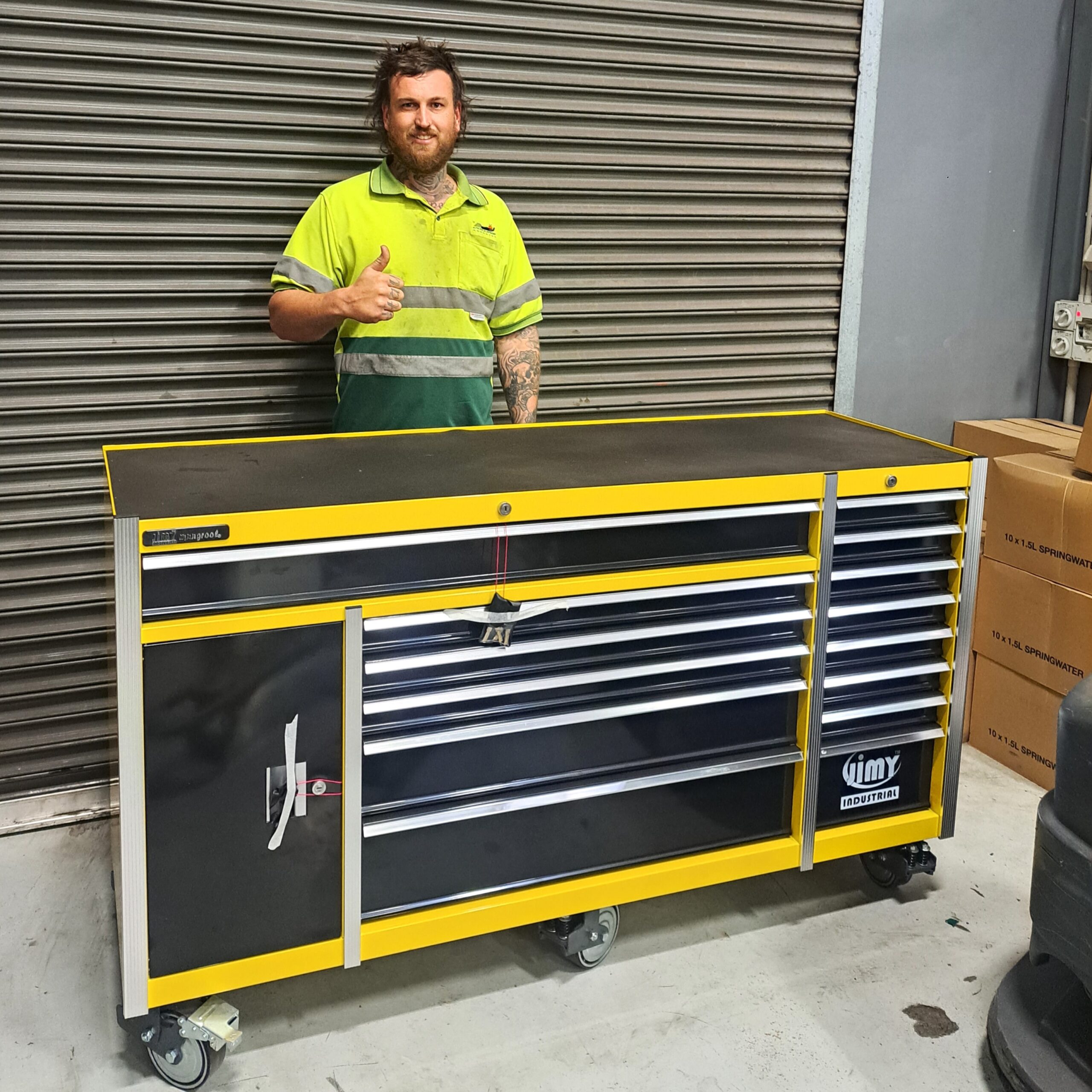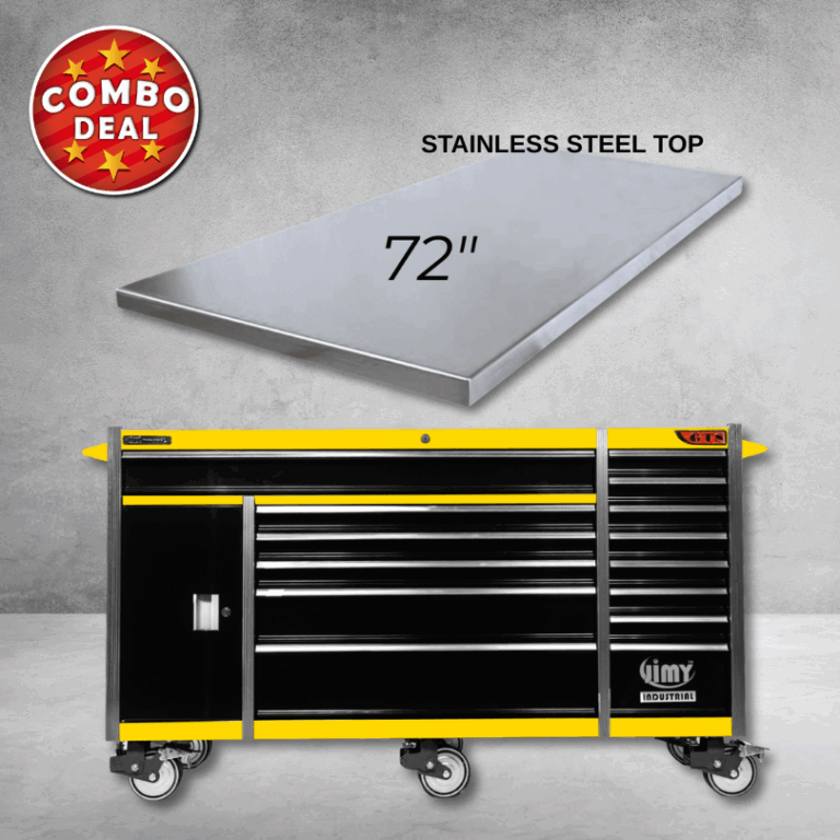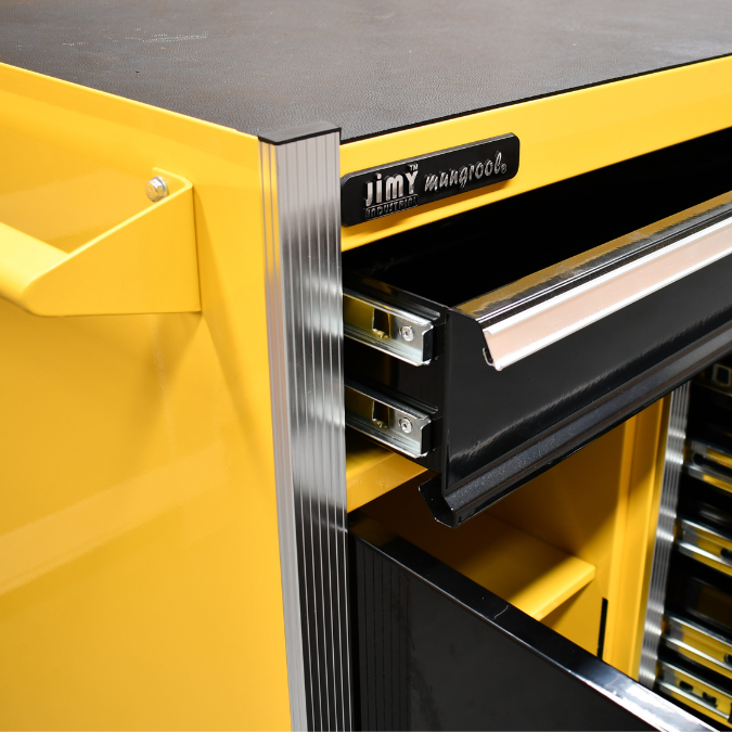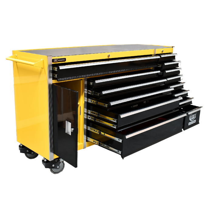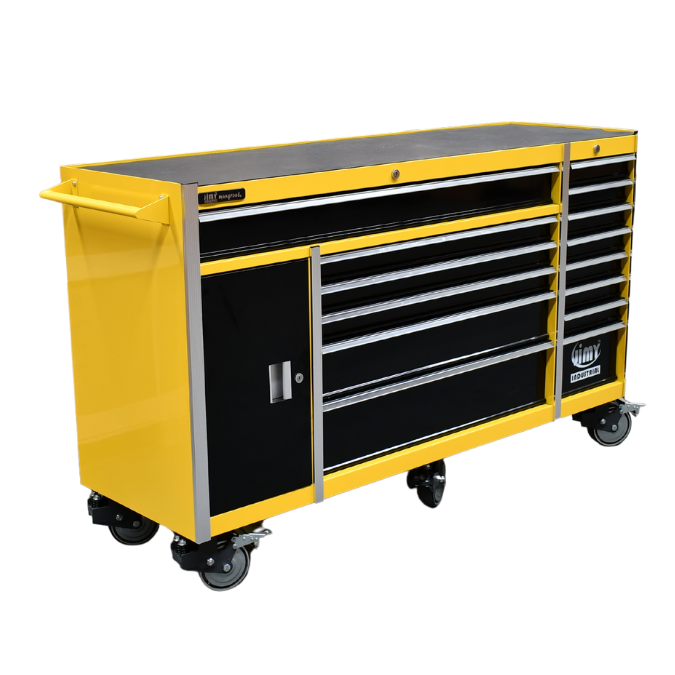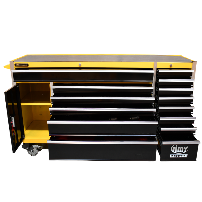 Jimy tool boxes are career spanning and built to last! Jimy tool boxes are fully modular to offer a number of storage combinations to fit your needs. With the extra deep 500mm drawers our 72” roller cabinet expands your storage capabilities and a massive 1680kgs in weight load capacity. It features 14 drawers with full-width drawer handles, pre-cut drawer liners and a single integrated barrel lock. Durable full extension ball bearings and a tough power coated finish make this storage a perfect fit for your home garage or commercial workshop.