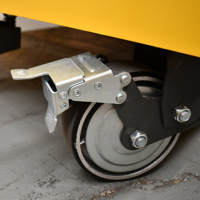 - 5” high and 2” wide caster wheels (2 fixed, 4 locking swivel) provide easy mobility when fully loaded