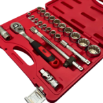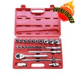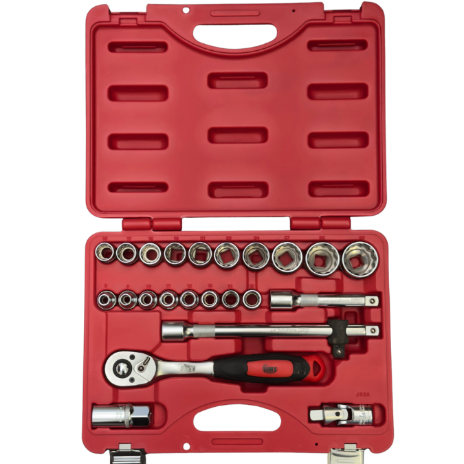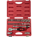 This 24 piece set contains 18 metric 12 point sockets ranging in size from 8 – 32mm a quality 72 tooth ratchet, two extensions (125mm, 250mm long) a 21mm spark plug socket, universal and a sliding T-bar adapter all packaged in a tough blow mould plastic carry case.