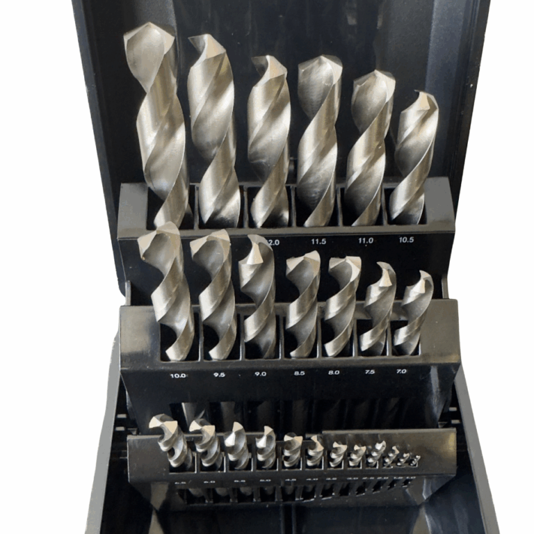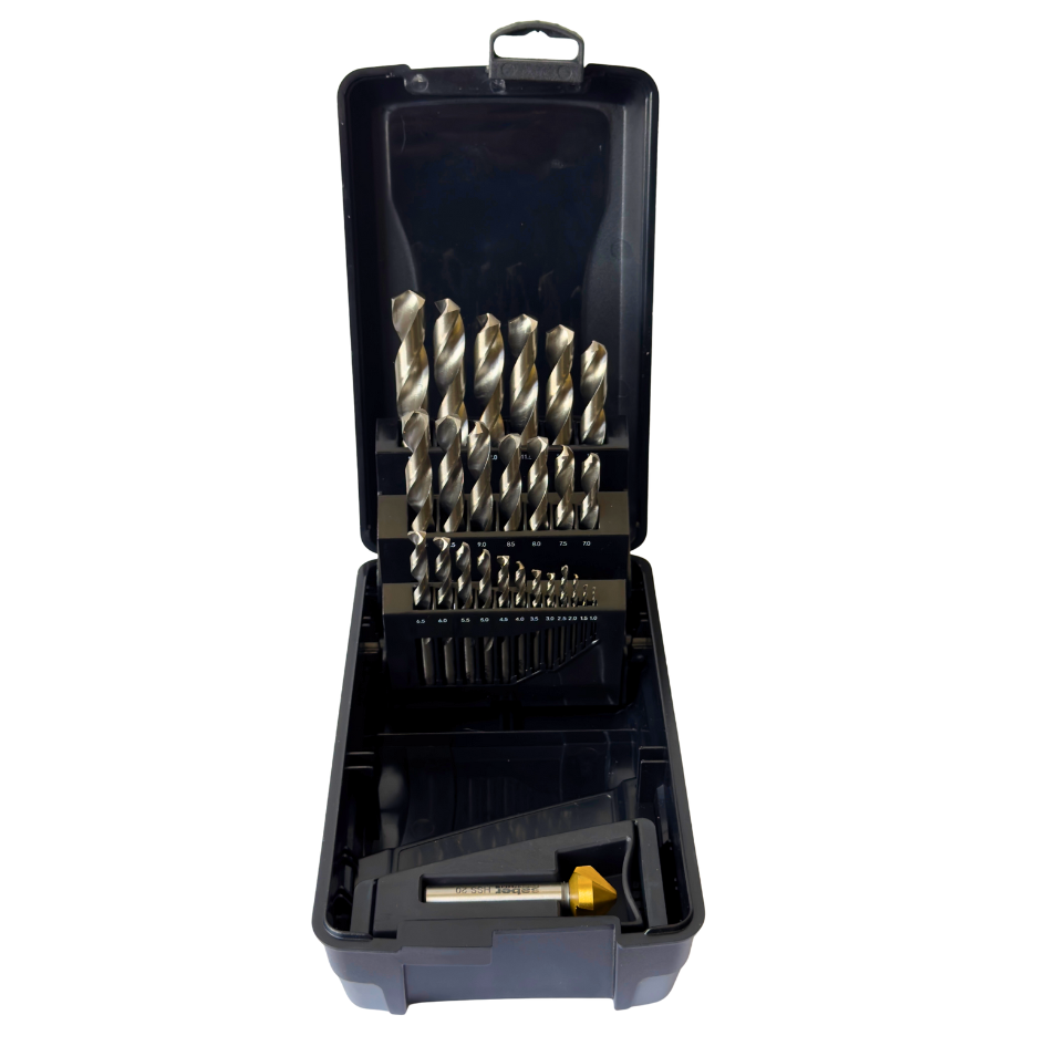 The Jimy Tools 25 piece metric drill bit set has been developed for trade use and around the home. Featuring 118 degree split point design these drill bits are self-centering which helps to minimise wandering when starting. Ideally suited to hand held drilling in a wide range of ferrous & non-ferrous materials. The point design also reduces the amount of effort required to penetrate the material. Made from M2 high speed steel offering the best combination of strength, heat and wear resistance.