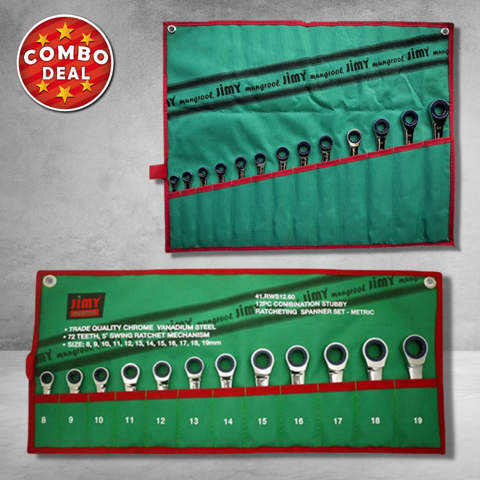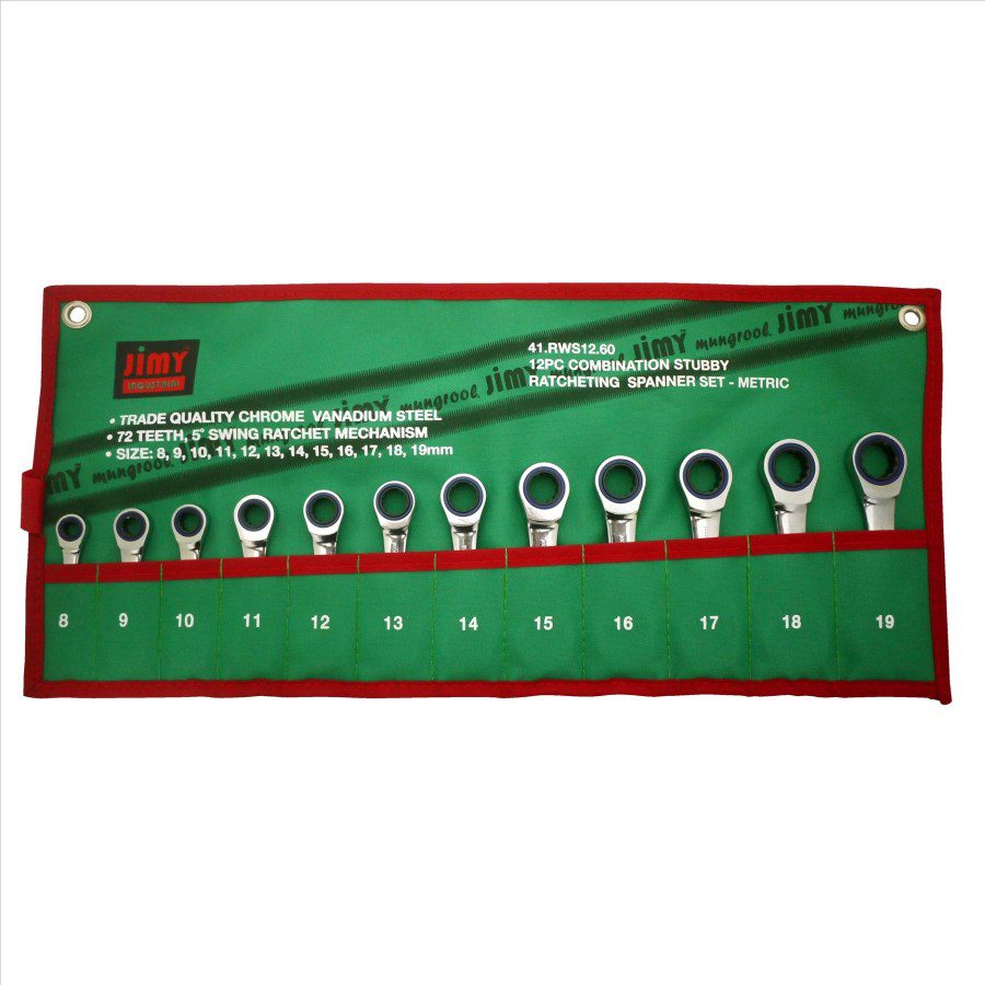 This Jimy Tools 13 Piece Ratcheting Spanner Wrench Set comes in the most common metric sizes ranging from 8mm up to 19mm. The ratcheting mechanism has 90 teeth and a 5 degree turn. The set comes in a convenient vinyl storage pouch with eyelets that can be hung on a peg board or wall, or stored in your tool box.