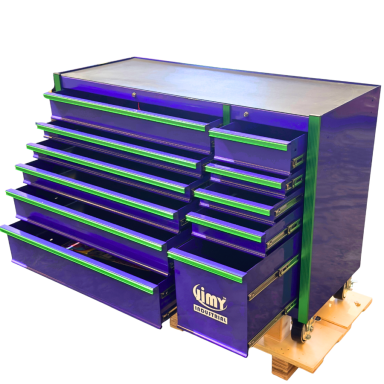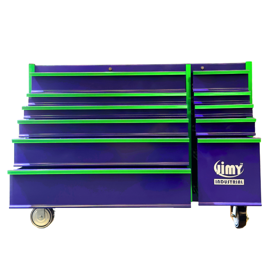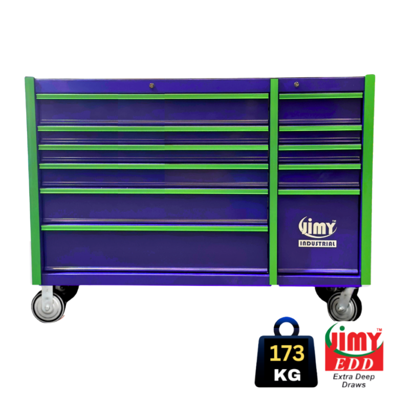The 11 drawer “Introductory” tool kit from Jimy Tools offers a great range of tools for the tradesperson. The kit consists of an 11-drawer roller cabinet, powder coated with a tough industrial finish, 1.2mm thick steel, fully lockable with rear internal locking system, dual gas strut system for lid and ball bearing slide drawers with twin slides on the deeper drawers. Included are metric 4mm – 32mm and SAE 5/32” – 1-1/4” sockets and a full complement of 1/4”, 3/8” and 1/2” drive socket accessories including ratchets, breaker bars, extensions bars from 50mm up to 900mm long.