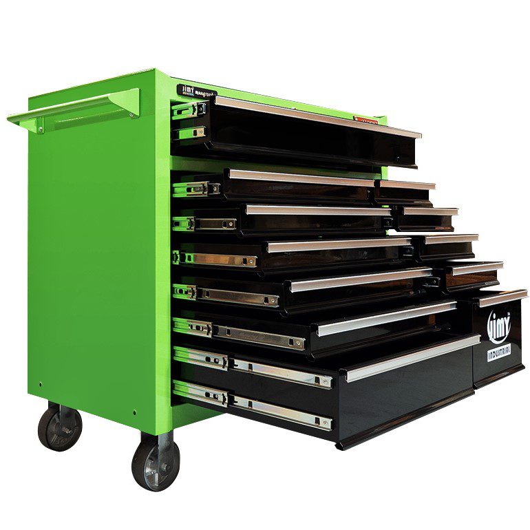 Jimy tool boxes are built to last with a tough industrial powder coating, 1.0mm thick steel, fully lockable with a rear internal locking system, dual gas strut system for lid & ball bearing slide drawers with twin slides on the deeper drawers.