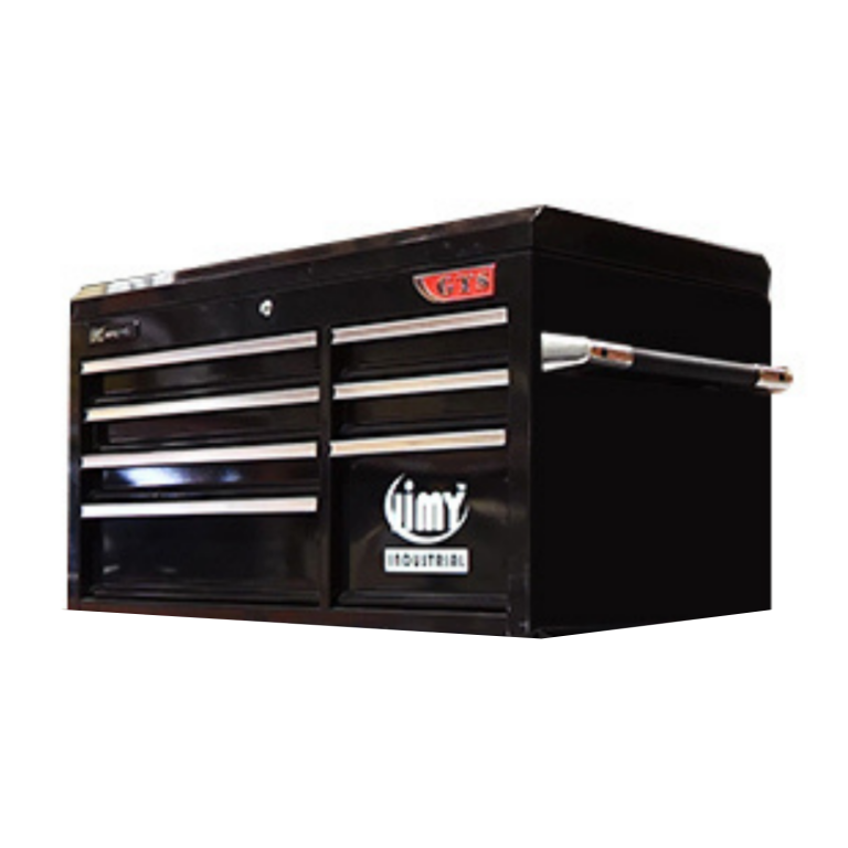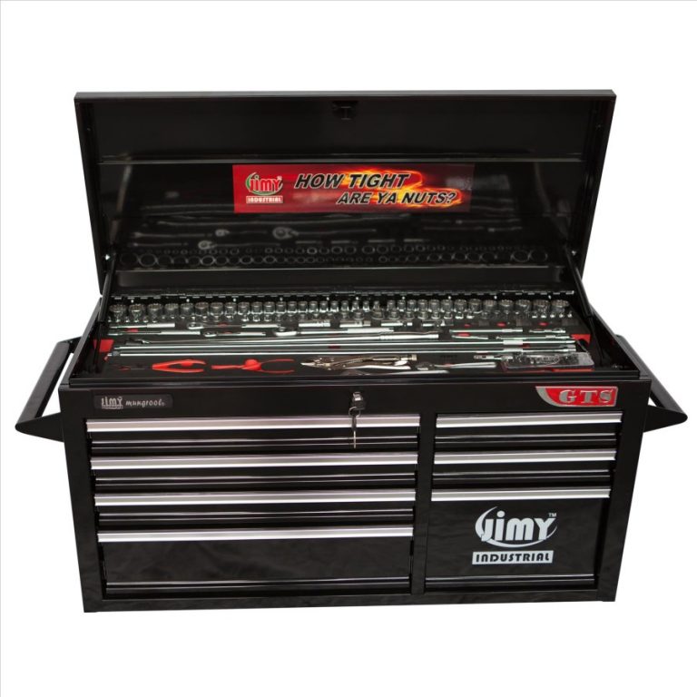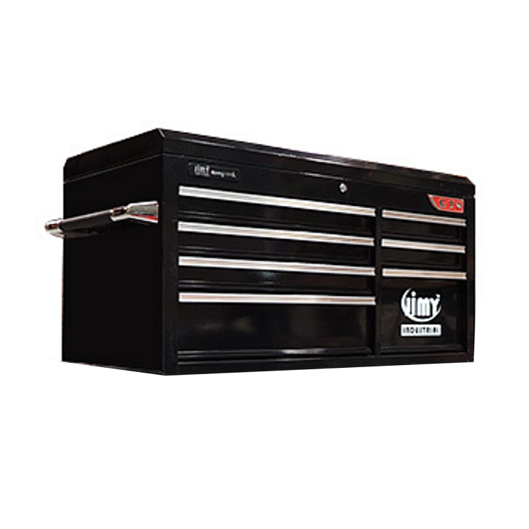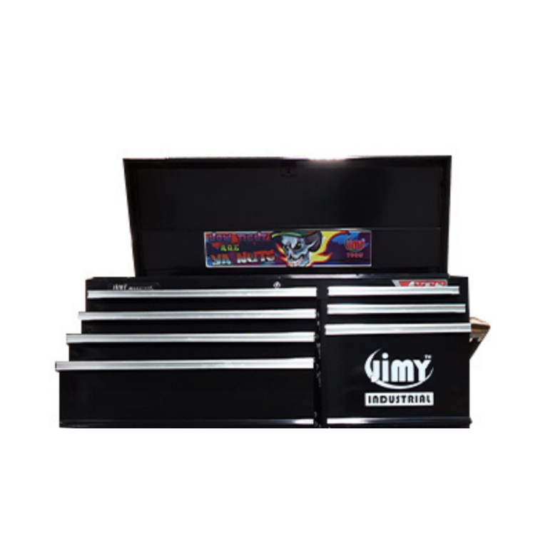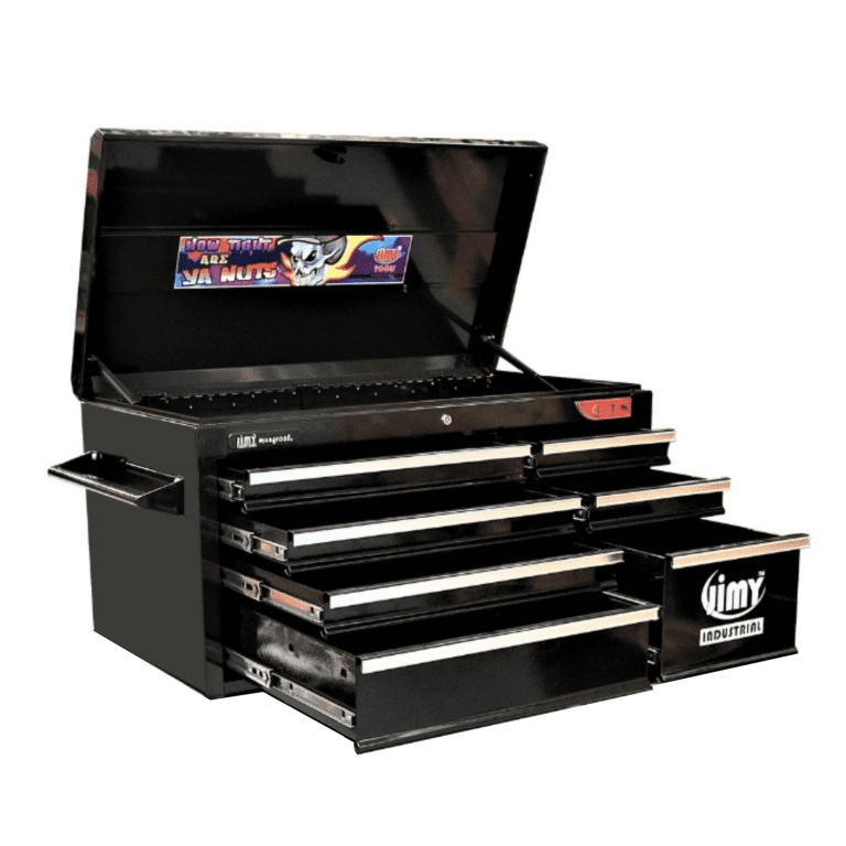 Jimy tool boxes are built to last tough industrial powder coating, 1.0mm thick steel, fully lockable with a rear internal locking system, dual gas struts for the lid & ball bearing slide drawers with twin slides on the deeper drawers