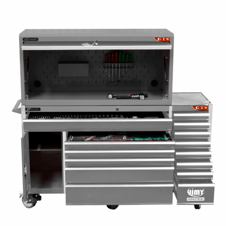 The 14 drawer “Introductory” hutch tool workshop from Jimy Tools offers a great range of tools for the professional mechanic. The kit consists of a hutch top box and an 11-drawer roller cabinet, all have been powder coated with a tough industrial finish, 1.2mm thick steel, fully lockable with rear internal locking system, dual gas strut system for the hutch and ball bearing slide drawers with twin slides on the deeper drawers. Included are metric 4mm – 32mm and SAE 5/32” – 1-1/4” sockets and a full complement of 1/4”, 3/8” and 1/2” drive socket accessories including ratchets, breaker bars, extensions bars from 50mm up to 900mm long.