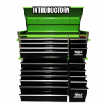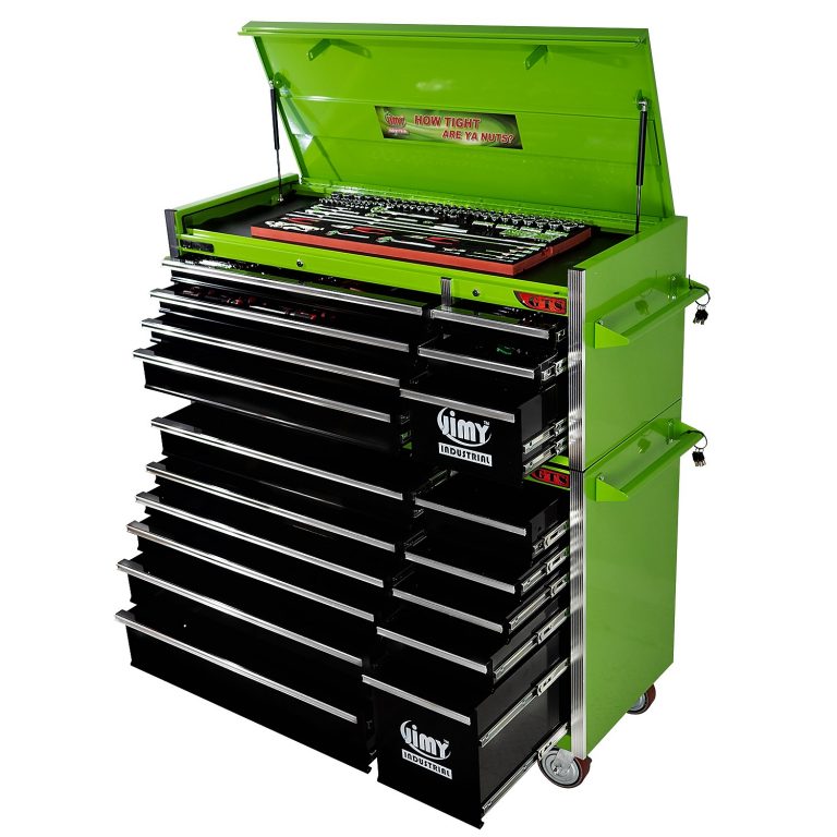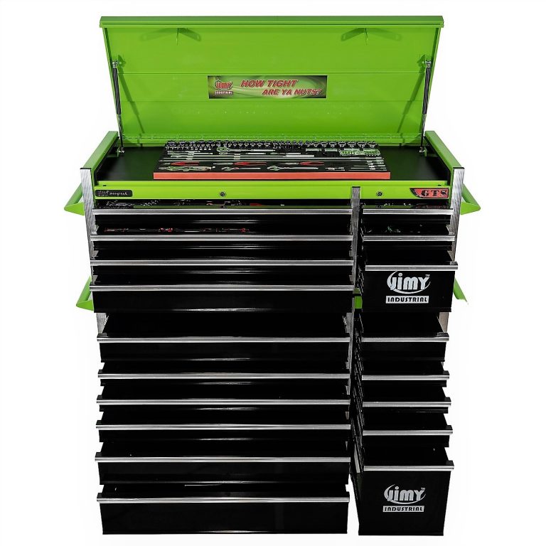 The 18 drawer “Introductory” tool kit from Jimy Tools offers a great range of tools for the tradesperson. The kit consists of a 7-drawer top box and an 11-drawer roller cabinet, all have been powder coated with a tough industrial finish, 1.0mm thick steel, fully lockable with rear internal locking system, dual gas strut system for lid and ball bearing slide drawers with twin slides on the deeper drawers. Included are metric 4mm – 32mm and SAE 5/32” – 1-1/4” sockets and a full complement of 1/4”, 3/8” and 1/2” drive socket accessories including ratchets, breaker bars, extensions bars from 50mm up to 900mm long.