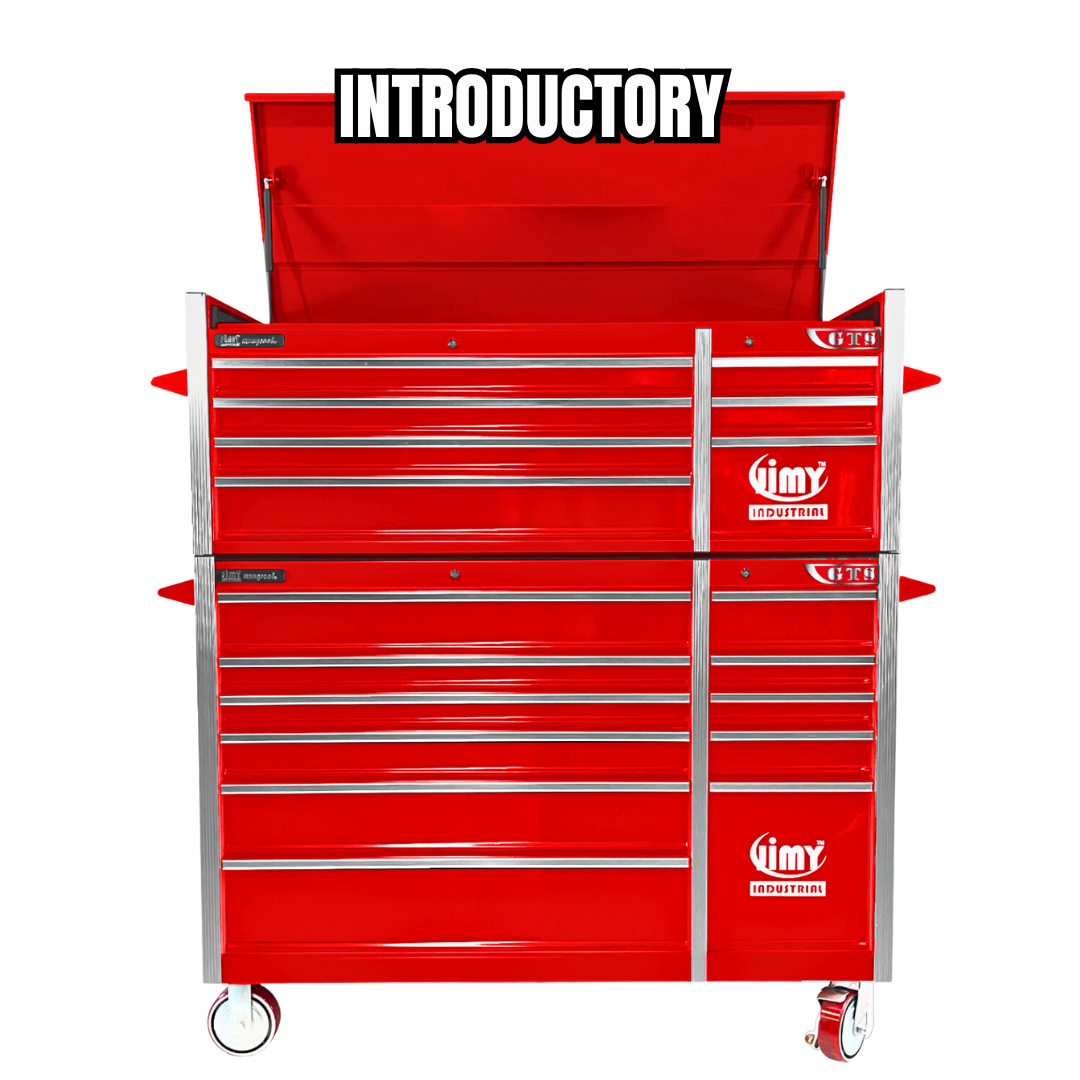 The 18 drawer “Introductory” tool kit from Jimy Tools offers a great range of tools for the tradesperson. The kit consists of a 7-drawer top box and an 11-drawer roller cabinet, all have been powder coated with a tough industrial finish, 1.0mm thick steel, fully lockable with rear internal locking system, dual gas strut system for lid and ball bearing slide drawers with twin slides on the deeper drawers. Included are metric 4mm – 32mm and SAE 5/32” – 1-1/4” sockets and a full complement of 1/4”, 3/8” and 1/2” drive socket accessories including ratchets, breaker bars, extensions bars from 50mm up to 900mm long.
