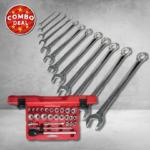 This 27 piece set contains 10 metric 12 point sockets ranging in size from 22mm up to 50mm, 12 SAE sockets from 7/8” up to 2”, a quality ratchet, two extensions and a sliding T-bar all packaged in a rugged blow mould plastic case.
