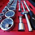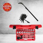 This 27 piece set contains 10 metric 12 point sockets ranging in size from 22mm up to 50mm, 12 SAE sockets from 7/8” up to 2”,a quality ratchet, two extensions and a sliding T-bar all packaged in a rugged blow mould plastic case.
