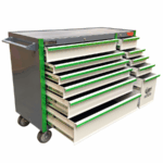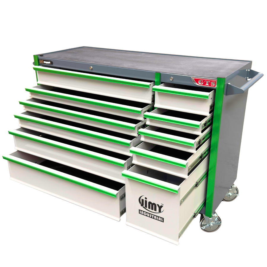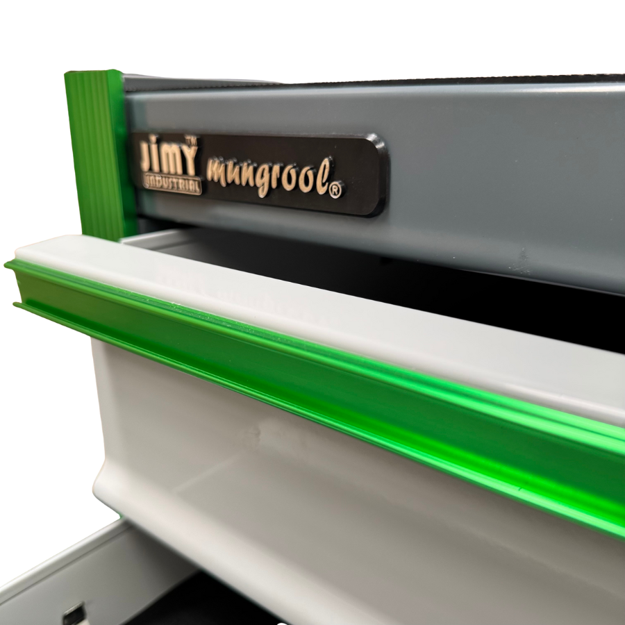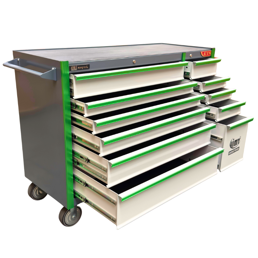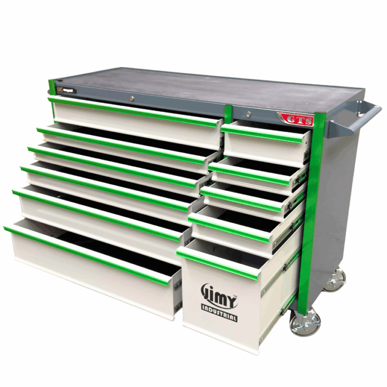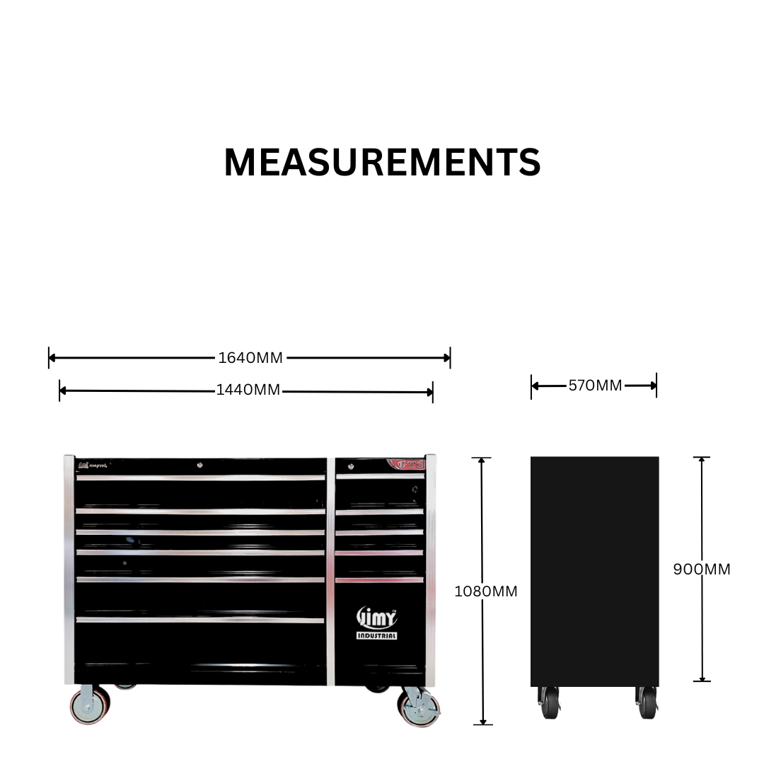 Jimy tool boxes are built to last! Tough industrial powder coating, 1.2mm gauge steel thickness, fully lockable & ball bearing slide rails on the drawers with twin slide rails on the deeper drawers.