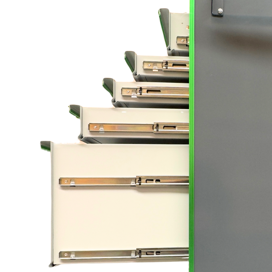 - Ball Bearing Slide Drawers with Twin Slides on the Deeper Drawers