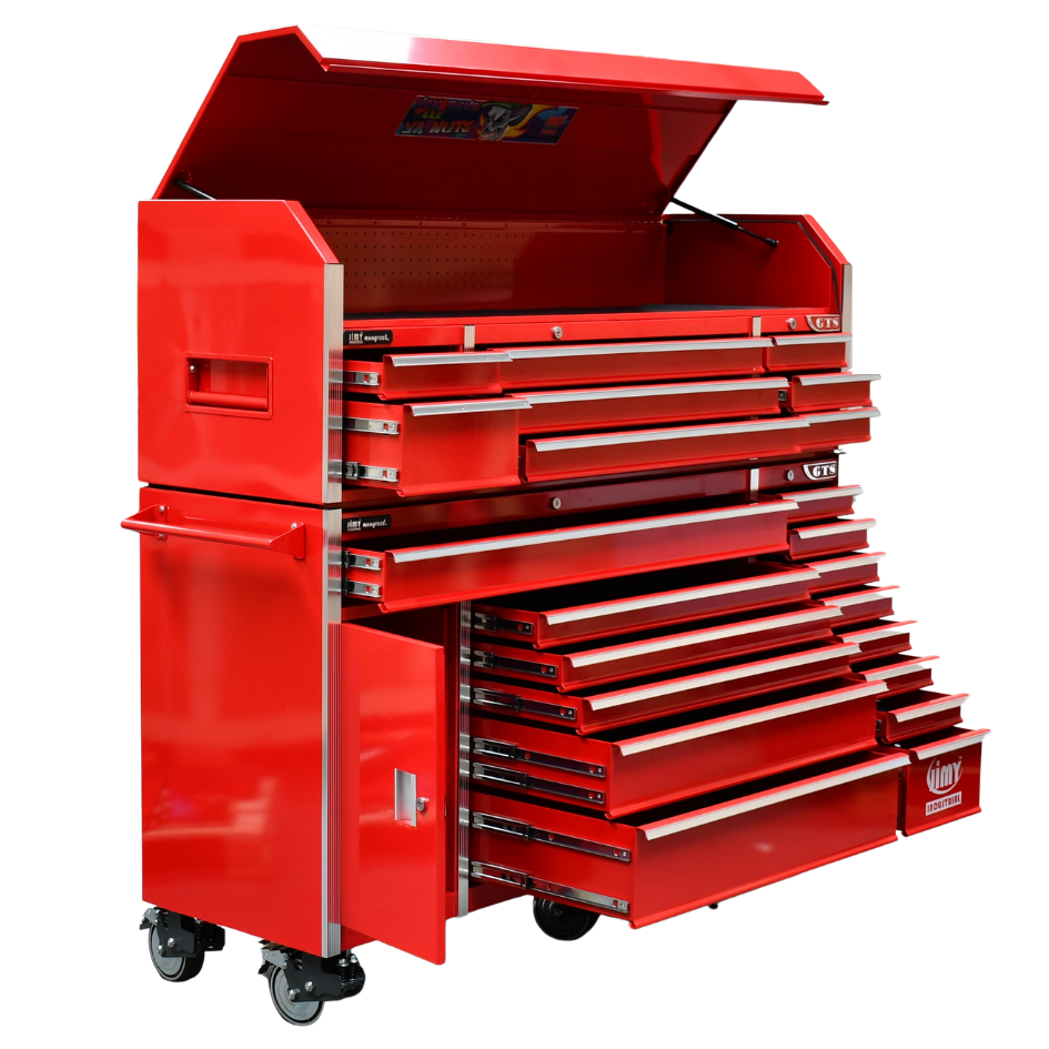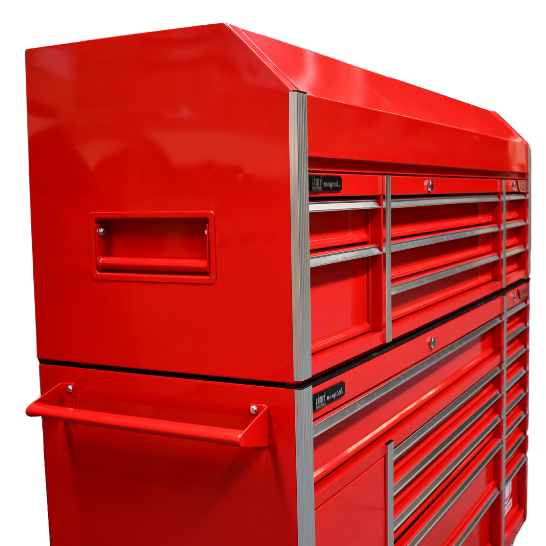 Jimy tool boxes are built to last! Tough industrial powder coating, 1.2mm gauge steel thickness, fully lockable & ball bearing slide rails on the drawers with twin slide rails on the deeper drawers.