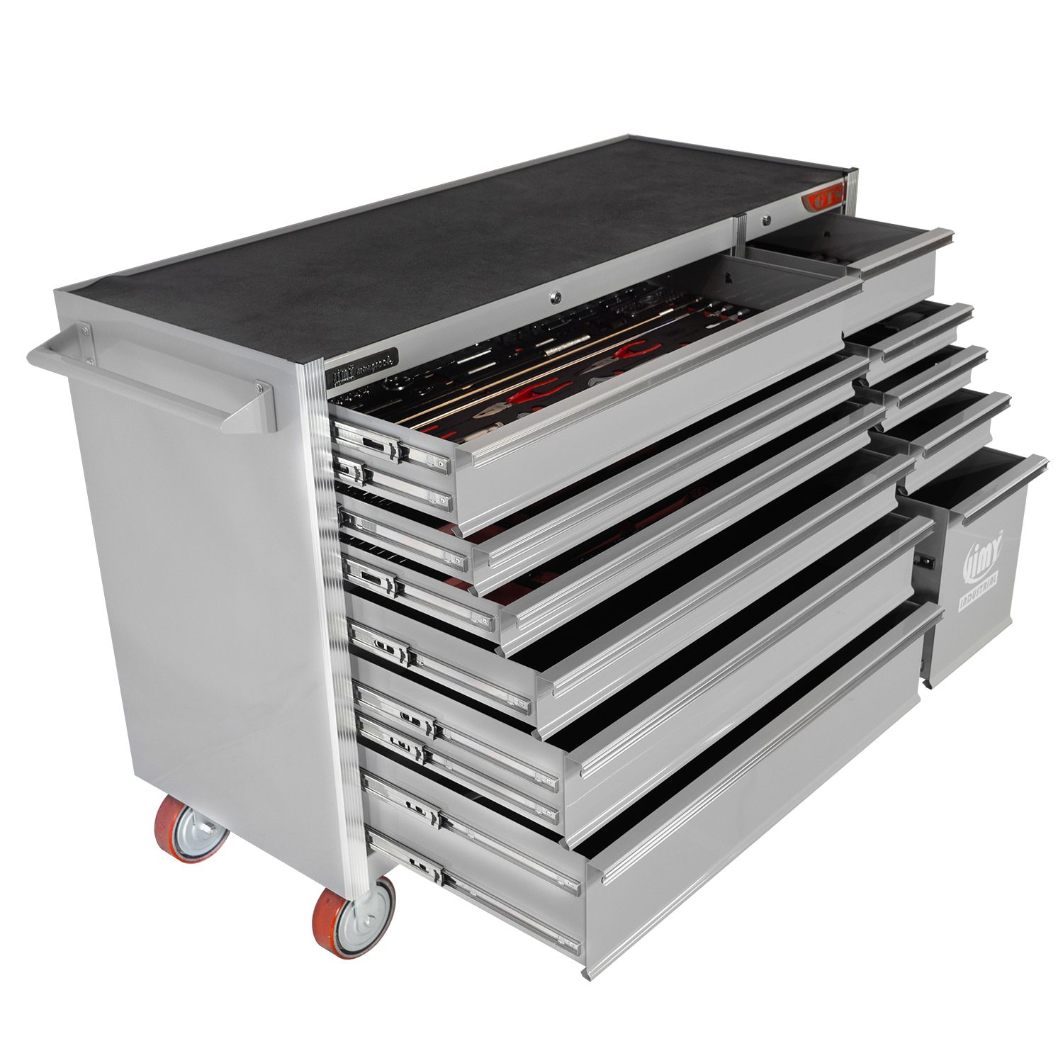 Jimy tool boxes are built to last! Tough industrial powder coating, 1.2mm gauge steel thickness, fully lockable & ball bearing slide rails on the drawers with twin slide rails on the deeper drawers.
