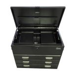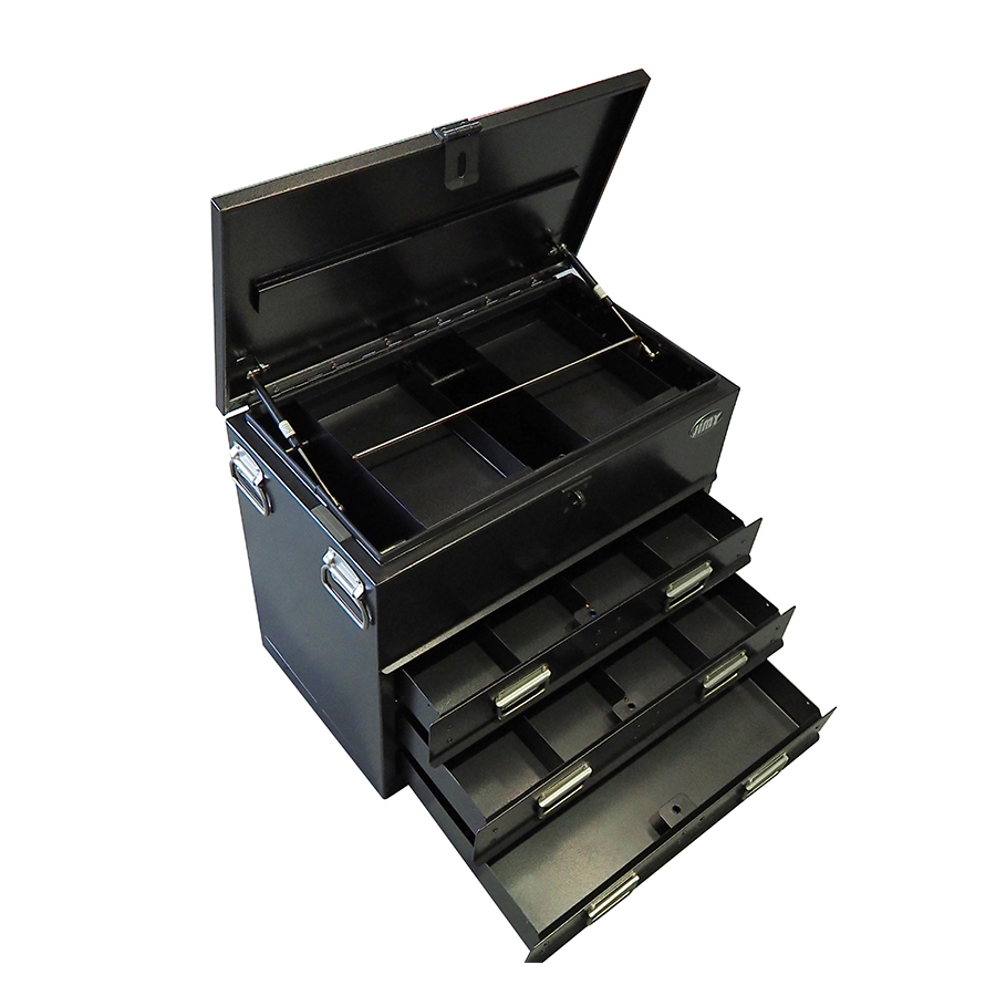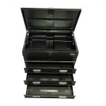 The gas struts hold the lid open in the top compartment. There are 4 lift out trays for the small items that you have to carry. Located underneath these lift out trays is a large compartment for extra storage. Then there are the 3 slide out drawers; 2 have four separate compartments to keep you organised and the bottom drawer is for the larger items. The box has 4 heavy duty side carry handles and each drawer has 2 chrome finished drawer pulls. The drawers also have an internal security pin.