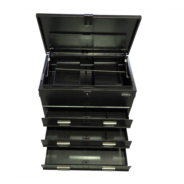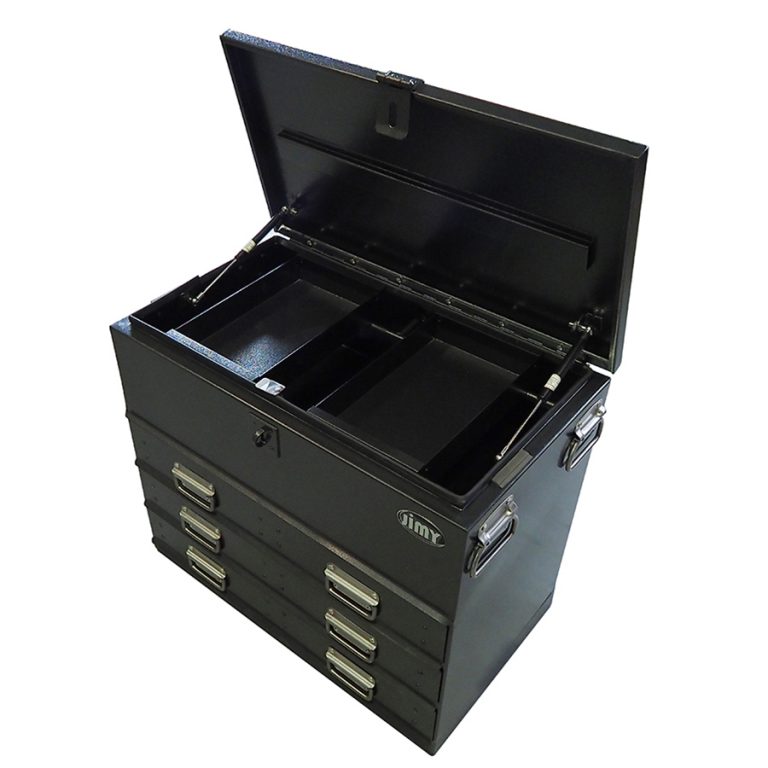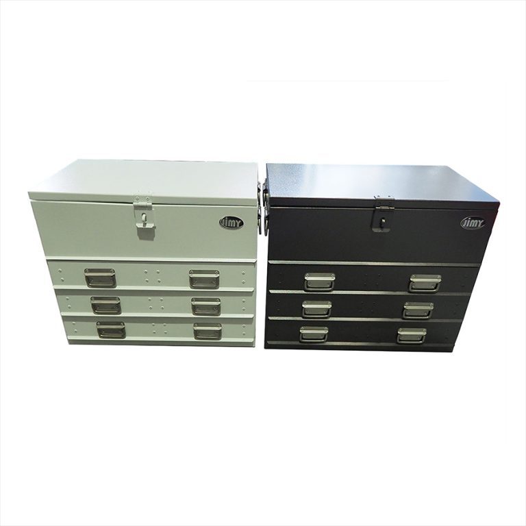 This tough box is made from 1.5mm thick steel; the lid has a piano hinge and 2 gas strut. There are 3 drawers and four lift out trays all finished with a UV stabilised powder coat finish.