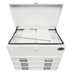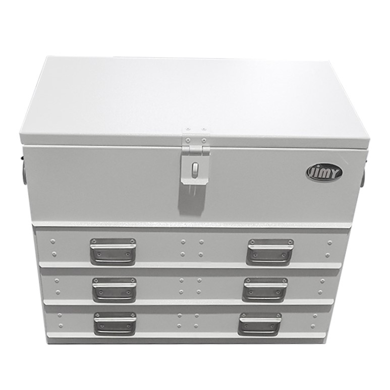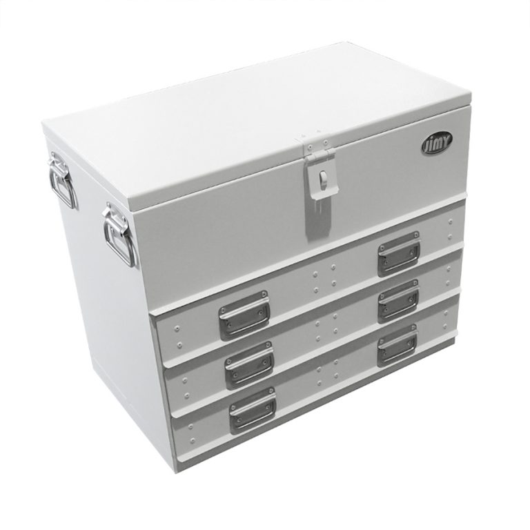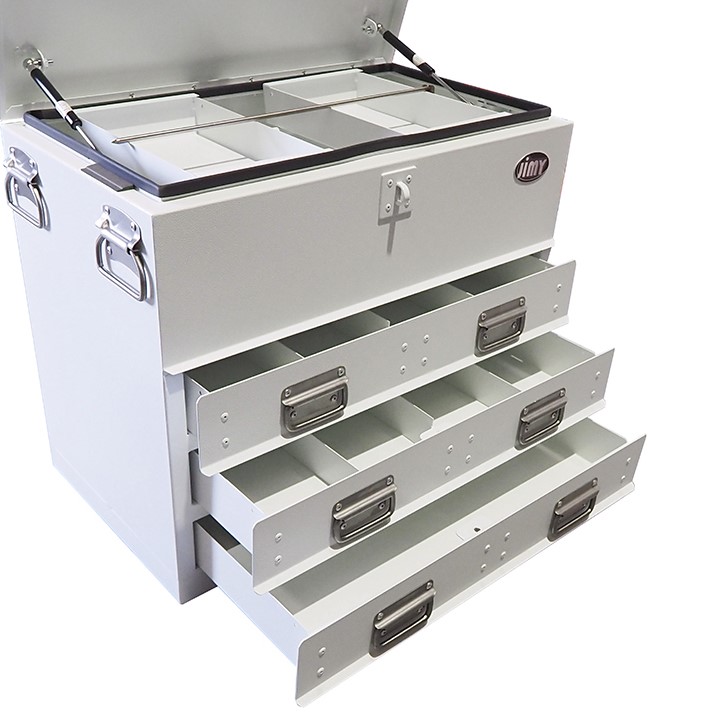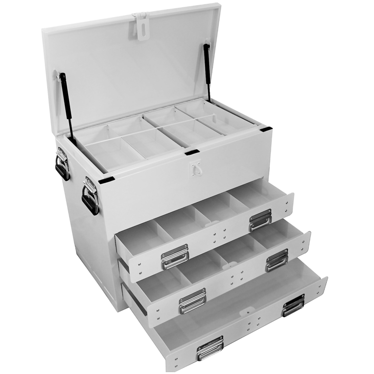 This tough box is made from 1.5mm thick steel; the lid has a piano hinge and 2 gas strut. There are 3 drawers and four lift out trays all finished with a UV stabilised powder coat finish.