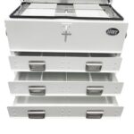 The gas struts hold the lid open in the top compartment. There are 4 lift out trays for the small items that you have to carry. Located underneath these lift out trays is a large compartment for extra storage. Then there are the 3 slide out drawers; 2 have four separate compartments to keep you organised and the bottom drawer is for the larger items. The box has 4 heavy duty side carry handles and each drawer has 2 chrome finished drawer pulls. The drawers also have an internal security pin.