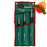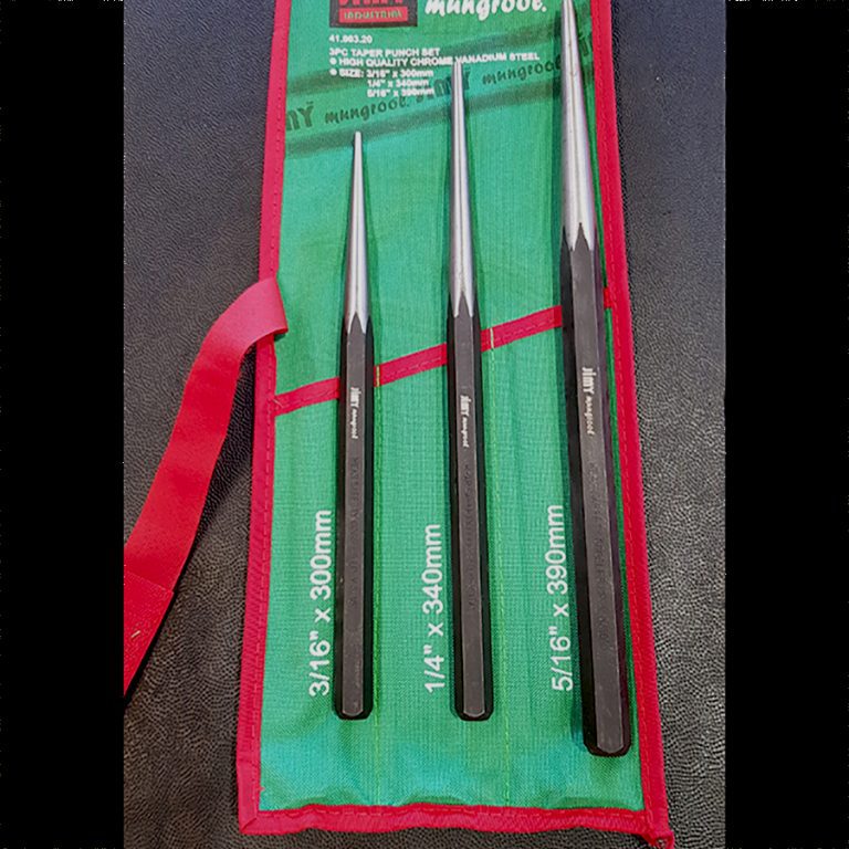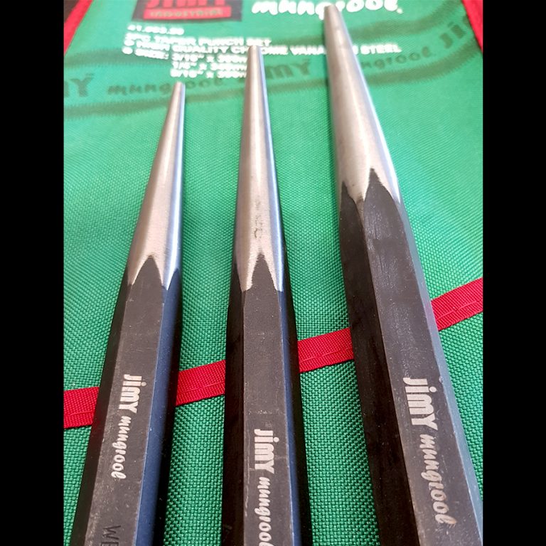 The Jimy Tools three piece long taper punch set is used to install and remove pins and shafts and for anytime you need a heavy duty punch. Also very useful for aligning holes in metal pieces or housings through which pins, rivets or bolts are inserted. Softened and tapered striking end reduces potential to chip. Set packaged in Jimy’s “Rip Stop” canvas pouch with hanging eyelets.