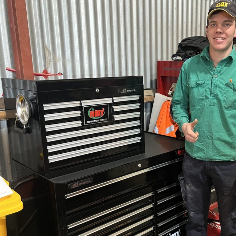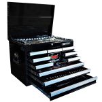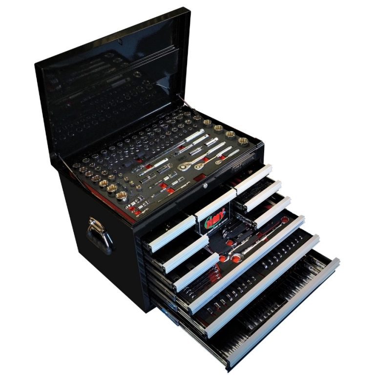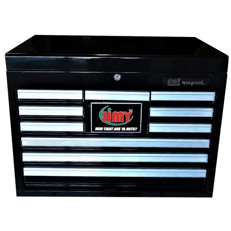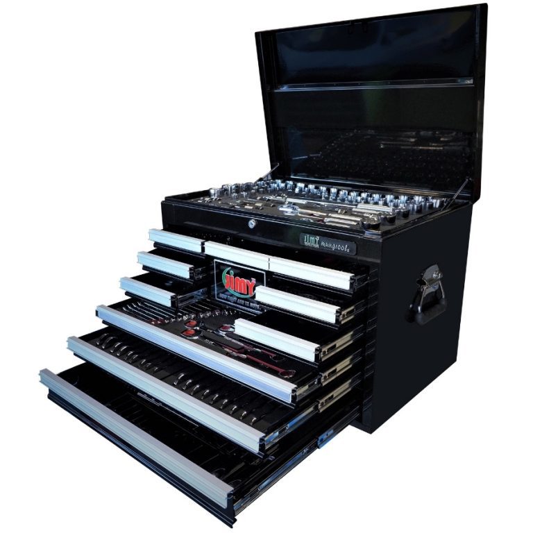 The Introductory 10 drawer mechanic’s tool kit from Jimy Tools what a good place to start if your new to the mechanical trades or an old hand this tool kit makes sense a full complement of sockets in 1/4” 3/8” and 1/2” drives with extension bars, ratchets and breaker bars to suit . There are both ratchet and standard ring open end spanners in metric and SAE, pliers, screwdrivers, flare nut spanners, Allen key sets etc.. Check out the full list of contents below. With the high density foam drawer inserts you can easily see if you have left a tool on the job. Jimy tool boxes are built to last tough industrial powder coating, 1.2mm thick steel, fully lockable with a rear internal locking system and ball bearing slide drawers.