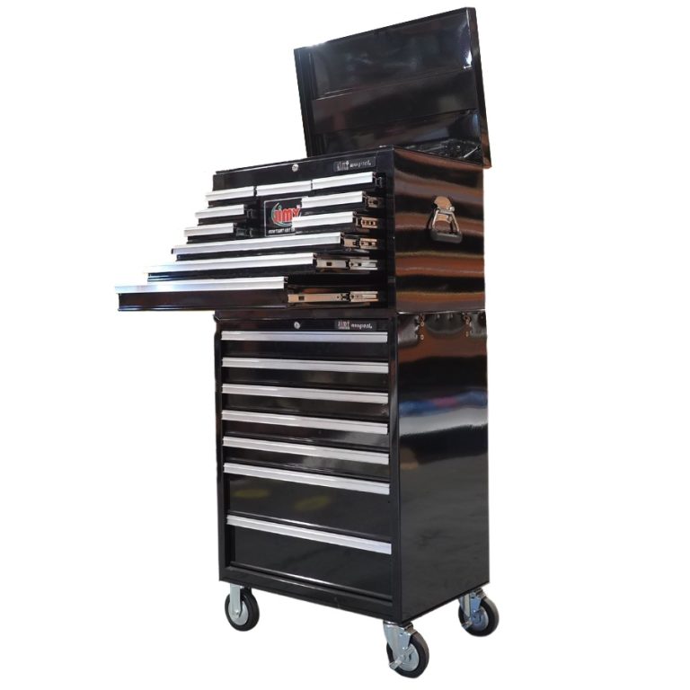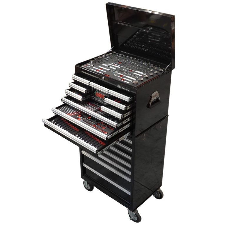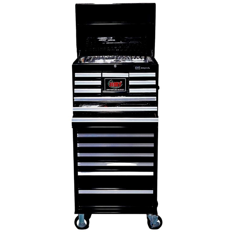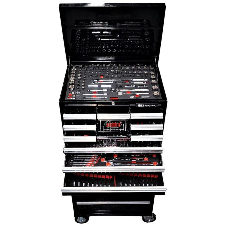 The Introductory 17 drawer mechanic’s tool kit from Jimy Tools what a good place to start if your new to the mechanical trades or an old hand this tool kit makes sense a full complement of sockets in 1/4” 3/8” and 1/2” drives with extension bars, ratchets and breaker bars to suit . There are both ratchet and standard ring open end spanners in metric and SAE, pliers, screwdrivers, flare nut spanners, Allen key sets etc.. Check out the full list of contents below. With the high density foam drawer inserts you can easily see if you have left a tool on the job. Jimy tool boxes are built to last tough industrial powder coating, 1.2mm thick steel, fully lockable with a rear internal locking system and ball bearing slide drawers.