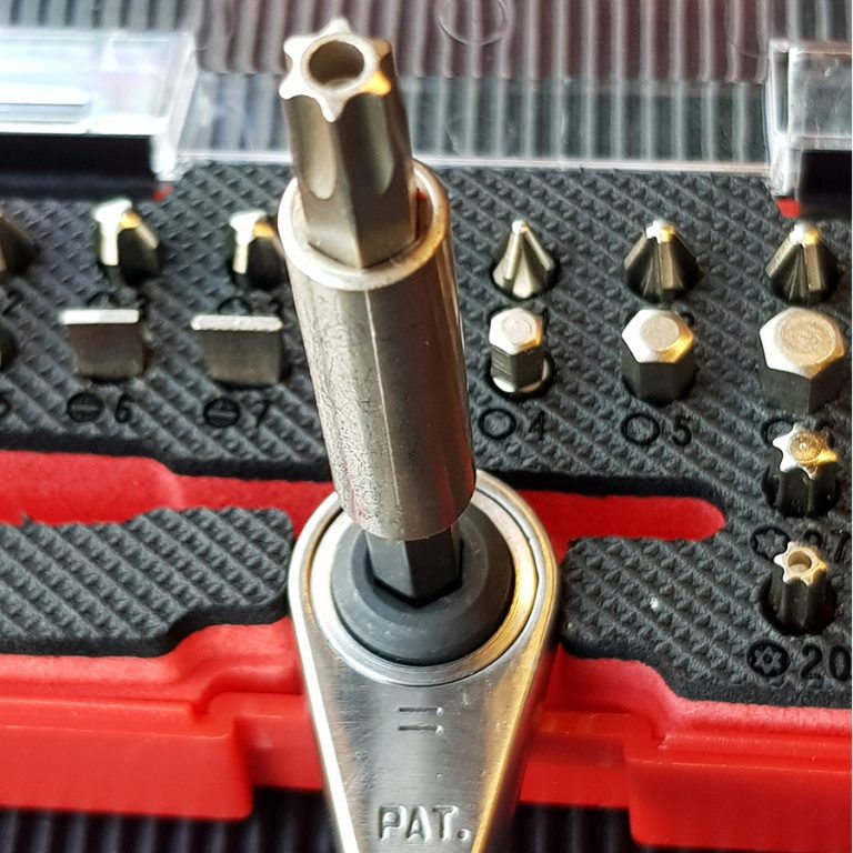 The Jimy Tools 38 piece security bit set is a handy inclusion to your tool kit the set includes a stainless steel ratchet handle, blade and Phillips screwdriver bits, tamper proof and standard Torx® bits, hex bits, a magnetic bit holder and 1/4” square drive adapter. The stainless steel ratchet handle is only 95mm long making this compact set ideal for use in confined spaces.