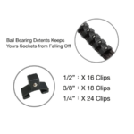 Each clip is fitted with a ball bearing retention detent, securely holding sockets in place and preventing loss during transport or daily use.