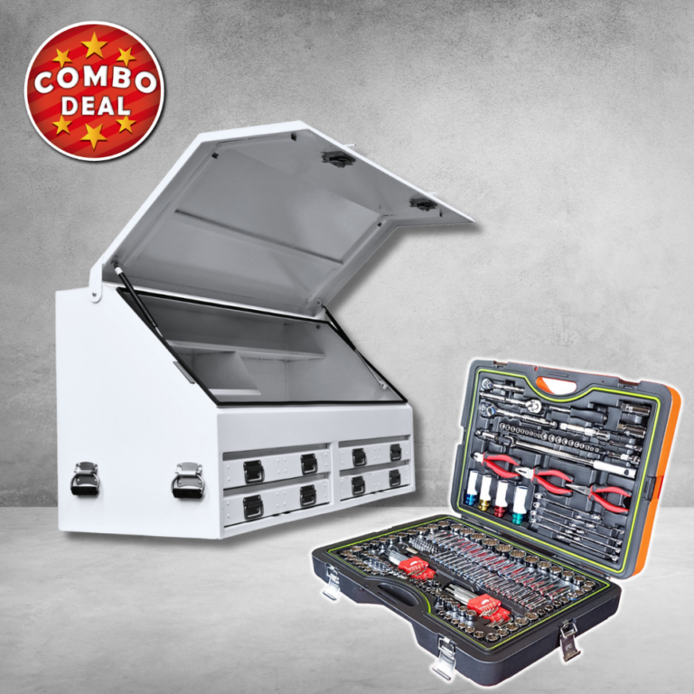 Do you need to take your tools with you in the ute or on the truck and need a heavy duty tool box to handle the bumps well why not try the new Jimy Tools Truck Box. Ideal for tradesman, mines, utes, light trucks, work and service vehicles. This tough box is made from 1.5mm thick steel with a sloping lid that is secured with 2 lockable T-handle catches and has gas struts to hold it open. The top section of the box has 1 full length shelf and 1 half length shelf. The 4 drawers have water gutters, ball bearing runners and an internal lock pin for security. The truck box is finished with a UV stabilized white powder coat finish.