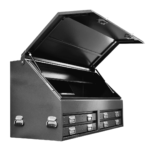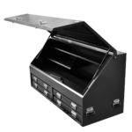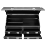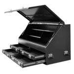 The gas struts hold the lid open in the top compartment. Located underneath the lid is a large compartment and shelving for extra storage. Then there are the 2 slide out drawers with water gutters. The box has 4 heavy duty side carry handles and each drawer has 2 chrome finished drawer pulls. The drawers also have an internal security pin.