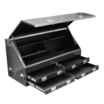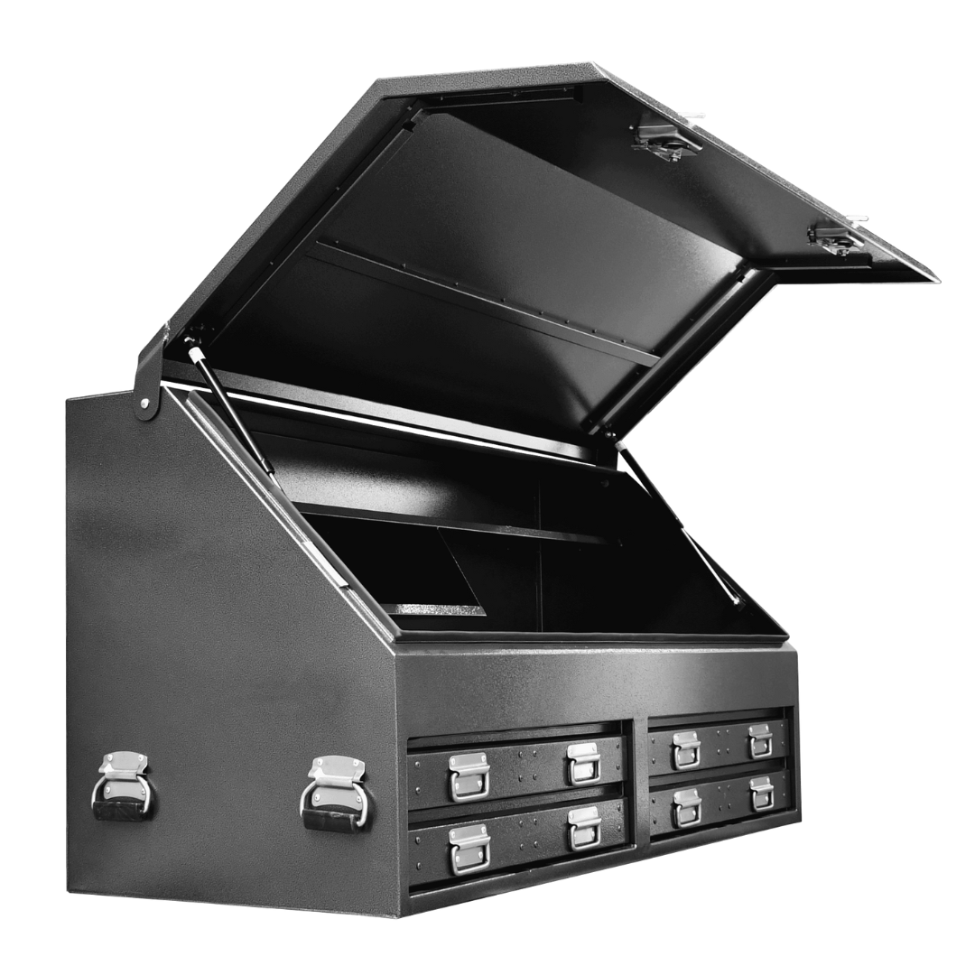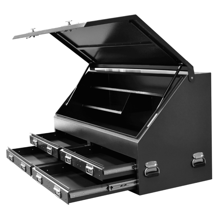 This tough box is made from 1.5mm thick steel; the lid has a piano hinge and 2 gas strut. There are 2 drawers all finished with a UV stabilised powder coat finish.