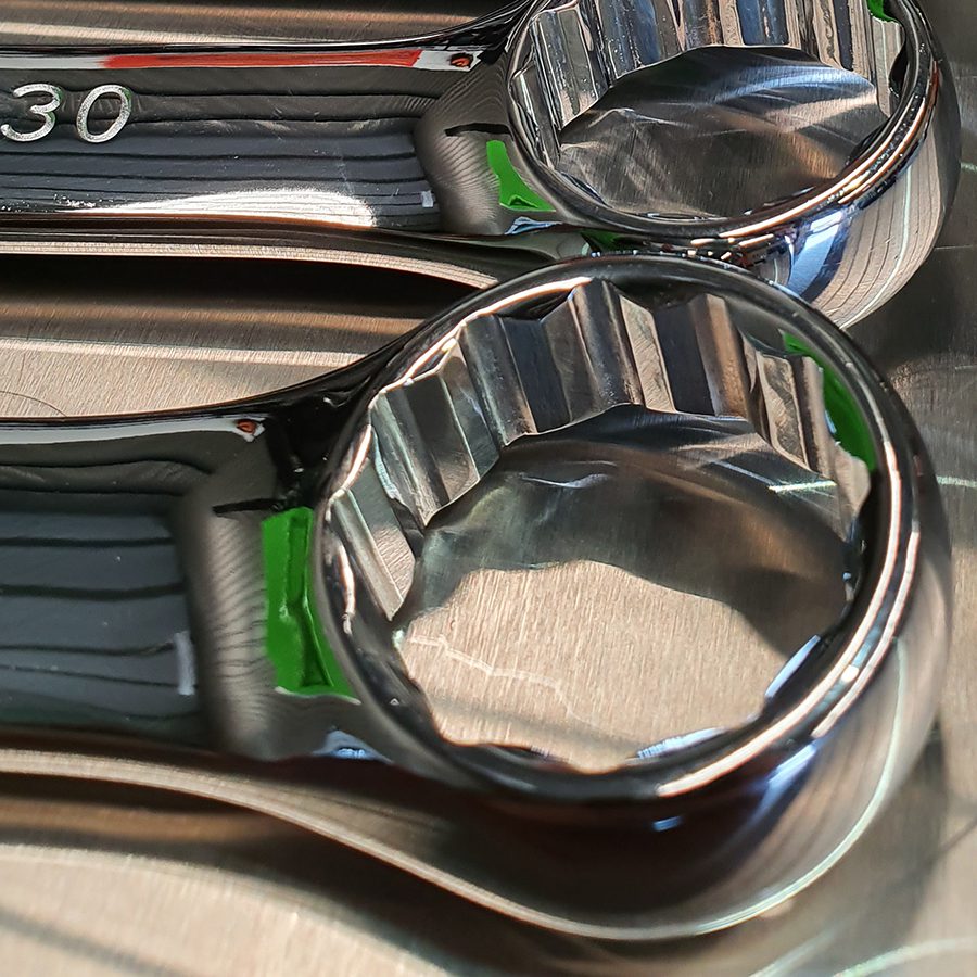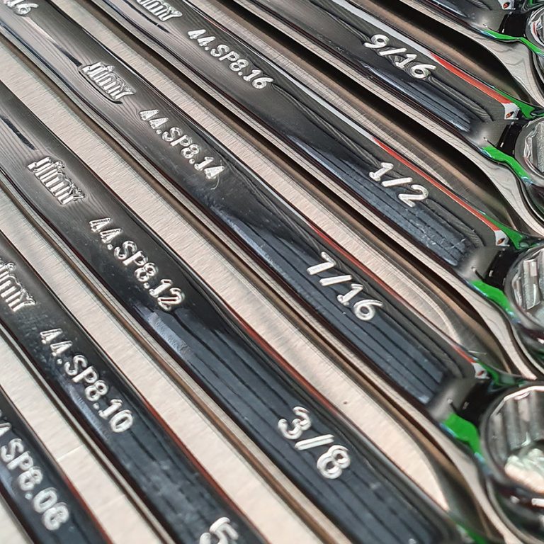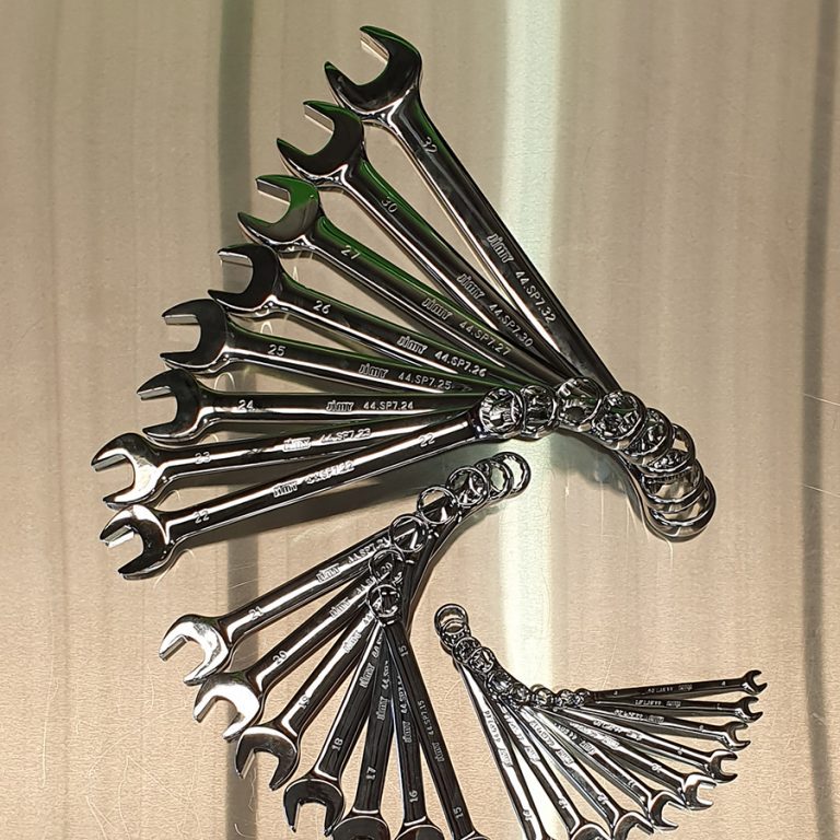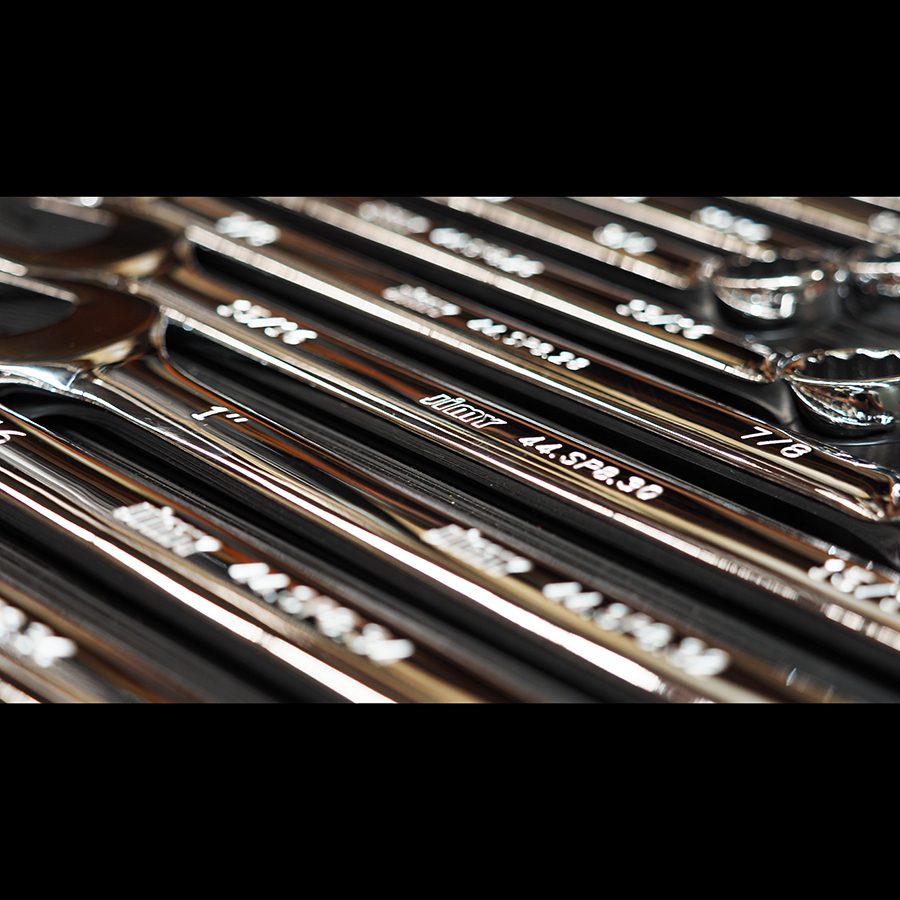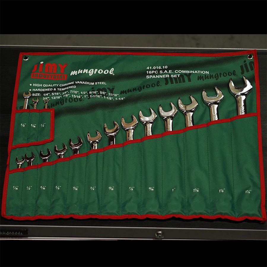 This metric and SAE ring open end spanner are based on the on the American ANSI standard and style of spanner with a 15 degree ring and jaw offset, these spanners with thick walls and a longer handle give more leverage and extra torque. Manufactured from quality chrome vanadium steel polished to a mirror finish, wrapped up in Jimy’s own “Rip Stop” canvas spanner roll and covered by Jimy’s lifetime warranty makes this an excellent quality set and great value for money.