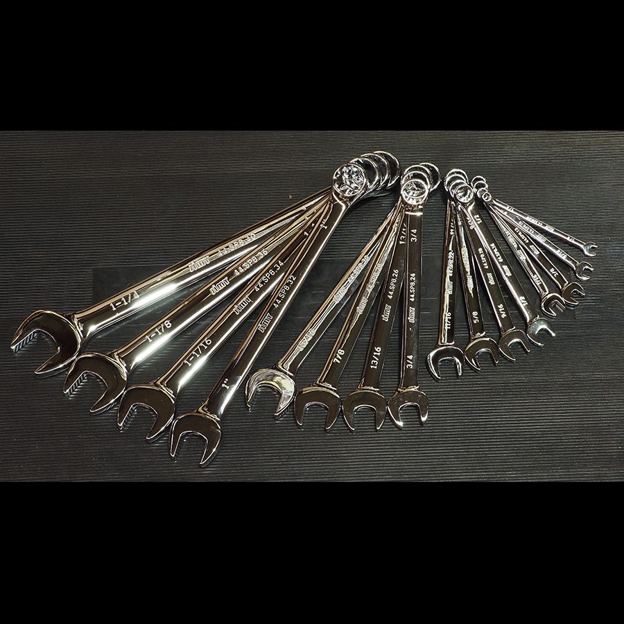 This 16 piece SAE ring open end spanner set includes sizes from 1/4” up to 1-1/4”