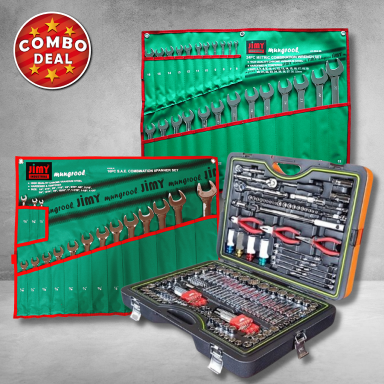 The Jimy Tools 198 piece combination socket set is ideal for the professional or home handyman alike featuring a large variety of sockets both standard and deep in 1/4”, 3/8” & 1/2” drive, 4 thin walled wheel nut sockets, a full range of socket accessories, ring open end spanners in both metric and imperial, hex keys in metric and imperial, pliers and bit sets all packed into a solid splash proof blow mould case. Ideal to keep in the car for that unforseen emergency or to form part of your home workshop tool kit, this very usable kit is backed by Jimy’s life time warranty and represents excellent value for money.