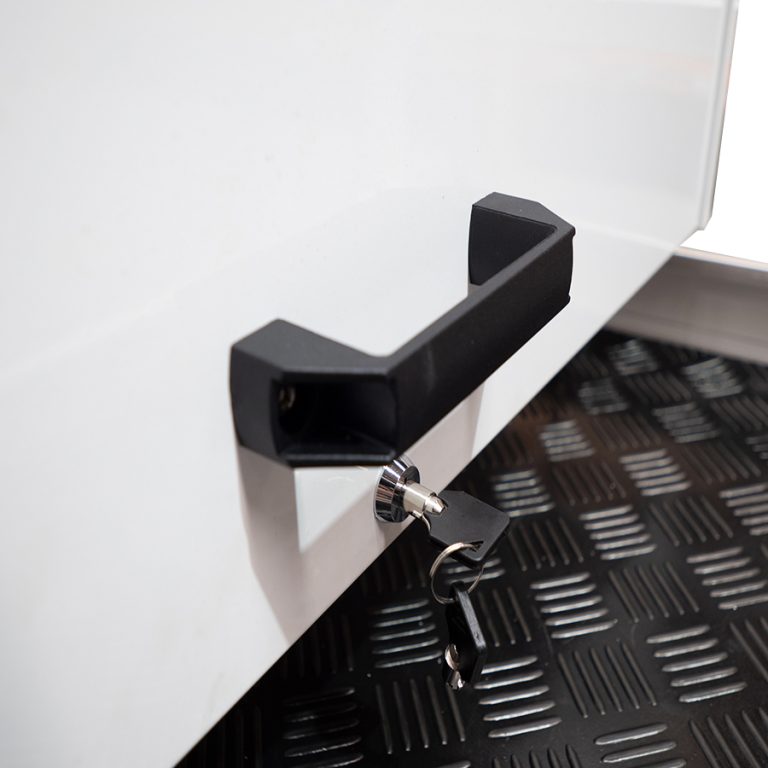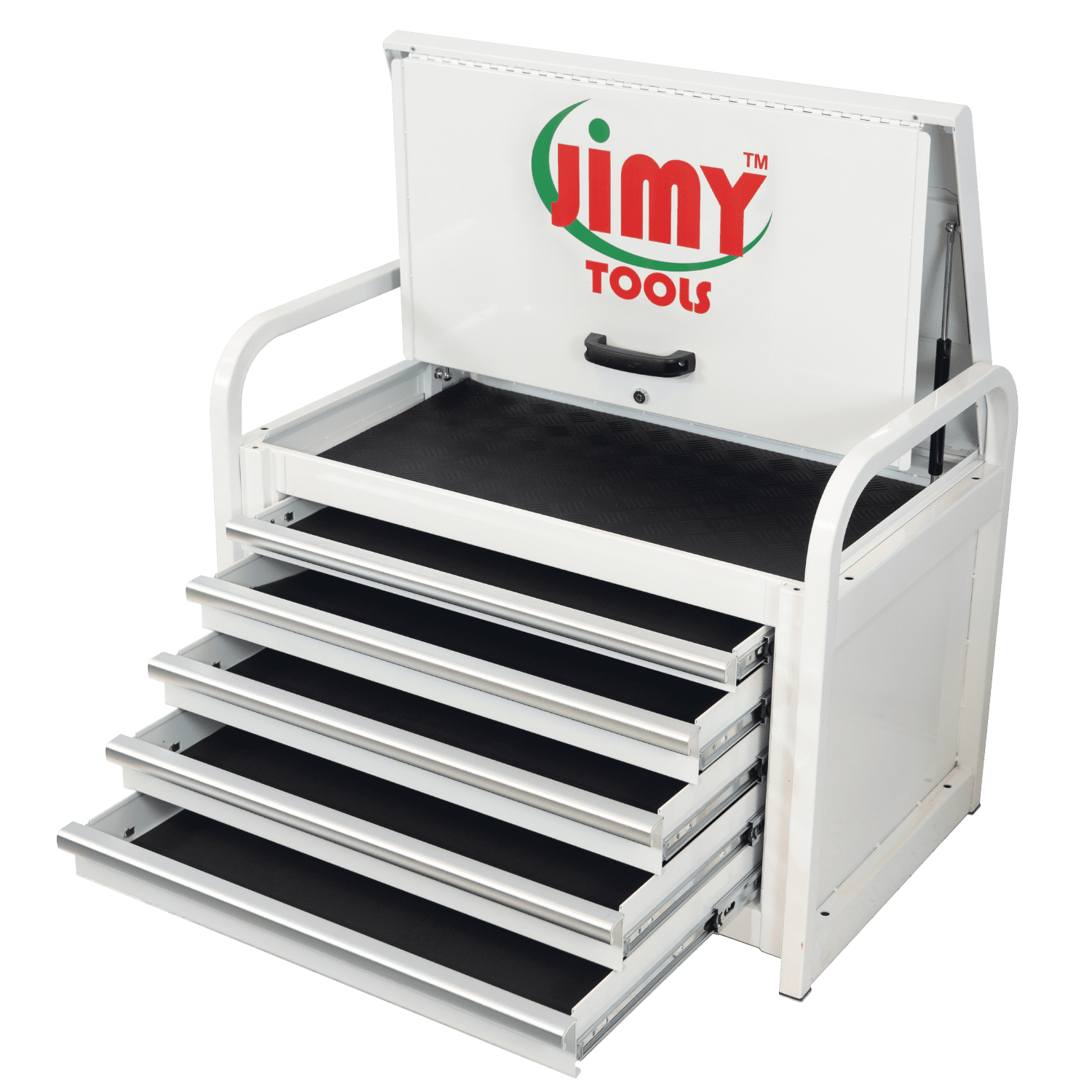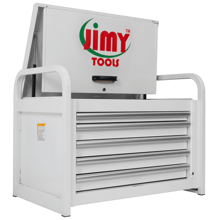 A Full-length Barrel Hinge and Gas struts give a smooth and precise lifting action to uncover the 5 drawers mounted on UHD ball bearing slides.