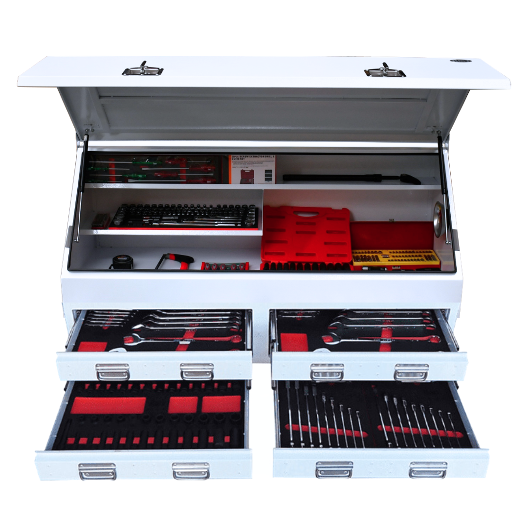 Do you need to take your tools with you in the ute or on the truck and need a heavy duty tool box to handle the bumps well why not try the new Jimy Tools Truck Box. This tough box is made from 1.5mm thick steel with a sloping lid that is secured with 2 lockable T-handle catches and has gas struts to hold it open. The top section of the box has 1 full length shelf and 1 half length shelf. The 4 drawers have water gutters, ball bearing runners and an internal lock pin for security. The truck box is finished with Hammertone finish.