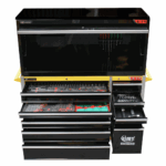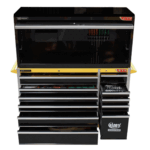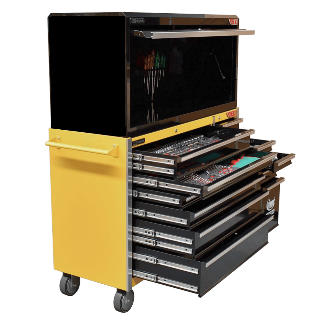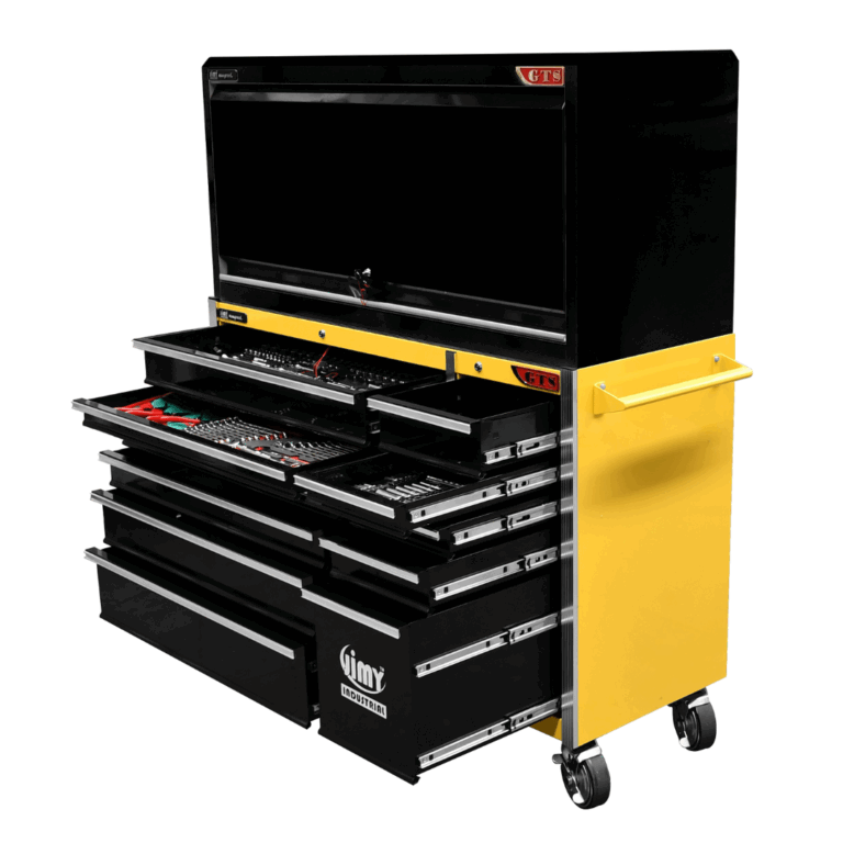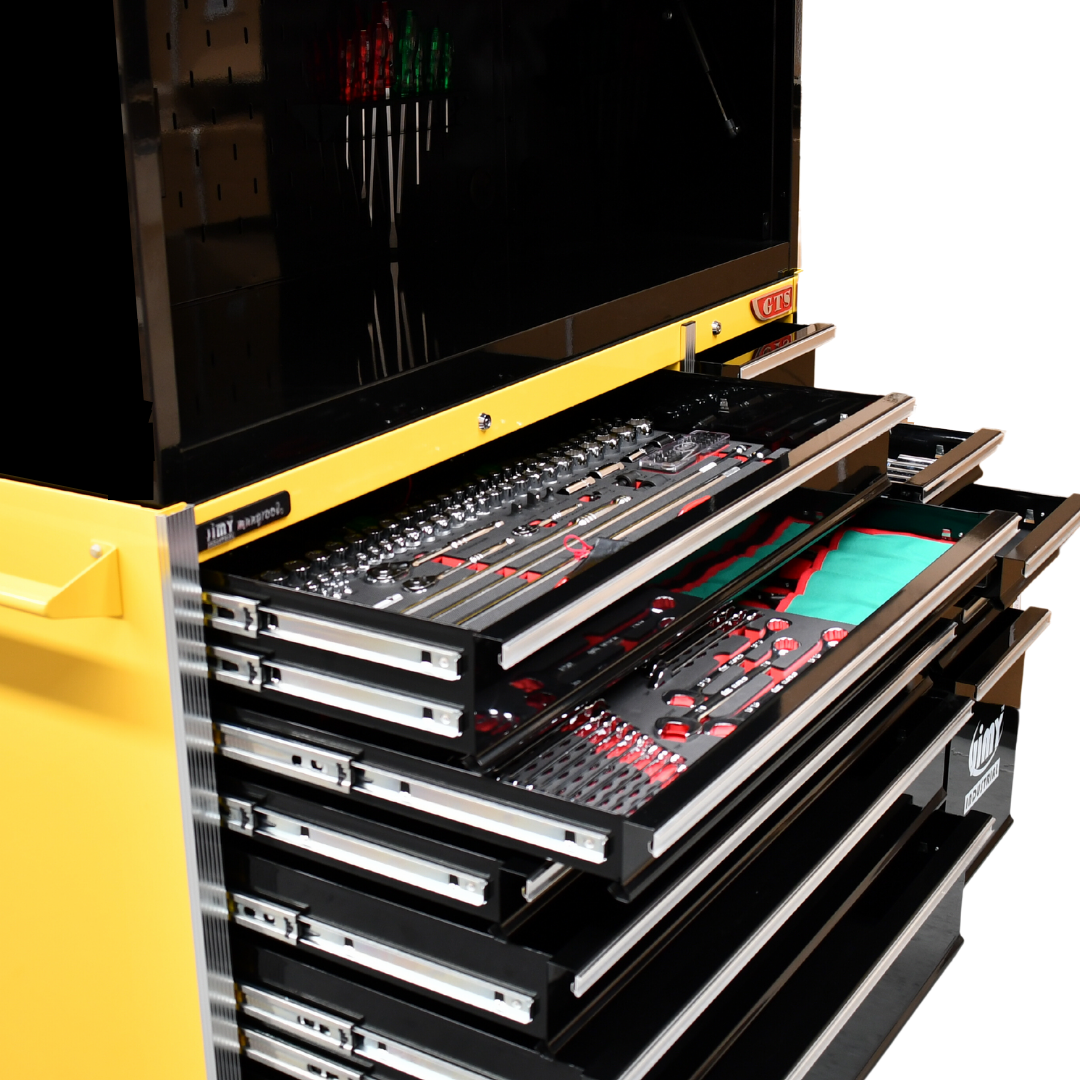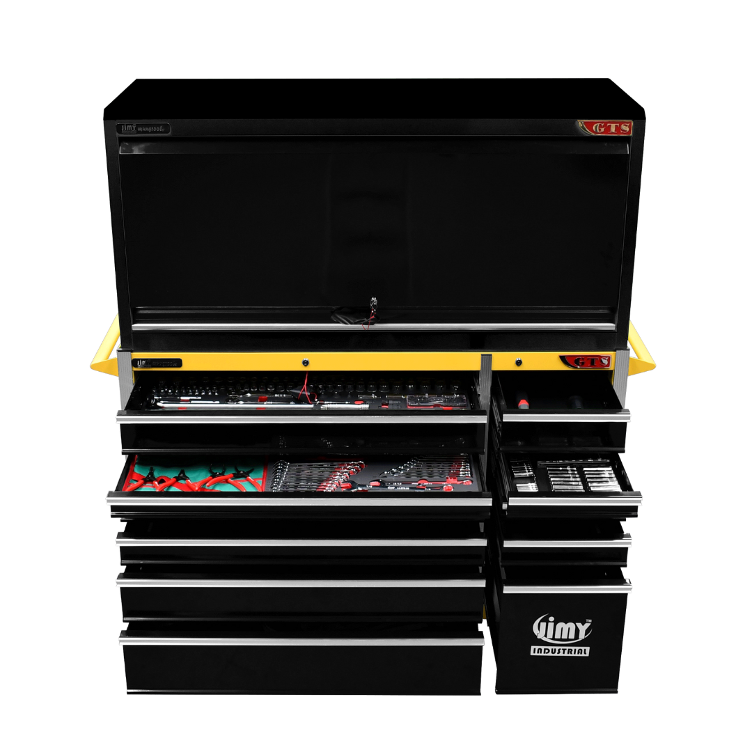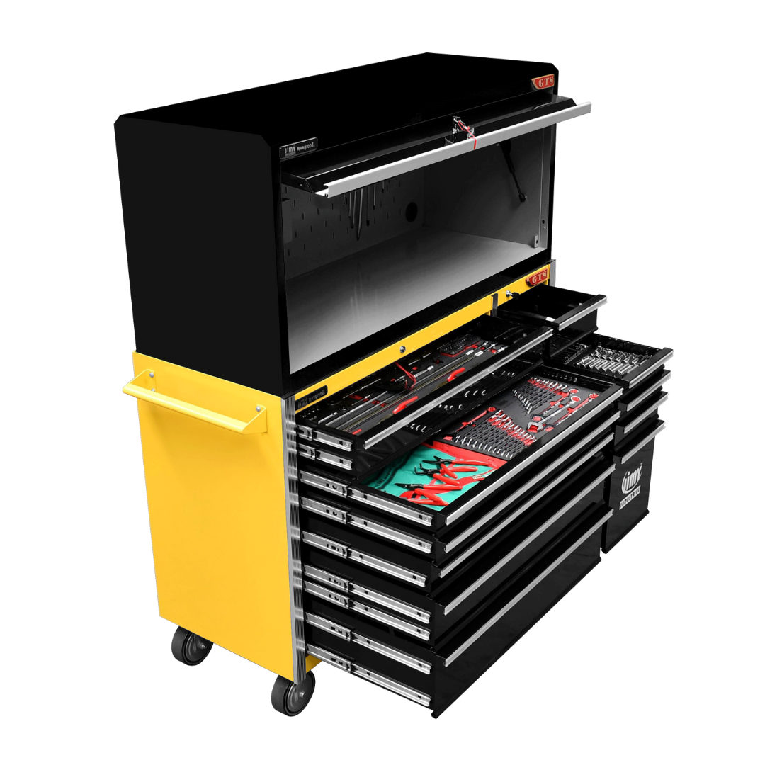 The 11 drawer “Intermediate” hutch tool workshop from Jimy Tools offers a great range of tools for the professional mechanic. The kit consists of a hutch top box and an 11-drawer roller cabinet, all have been powder coated with a tough industrial finish, 1.2mm thick steel, fully lockable with rear internal locking system, dual gas strut system for the hutch and ball bearing slide drawers with twin slides on the deeper drawers.