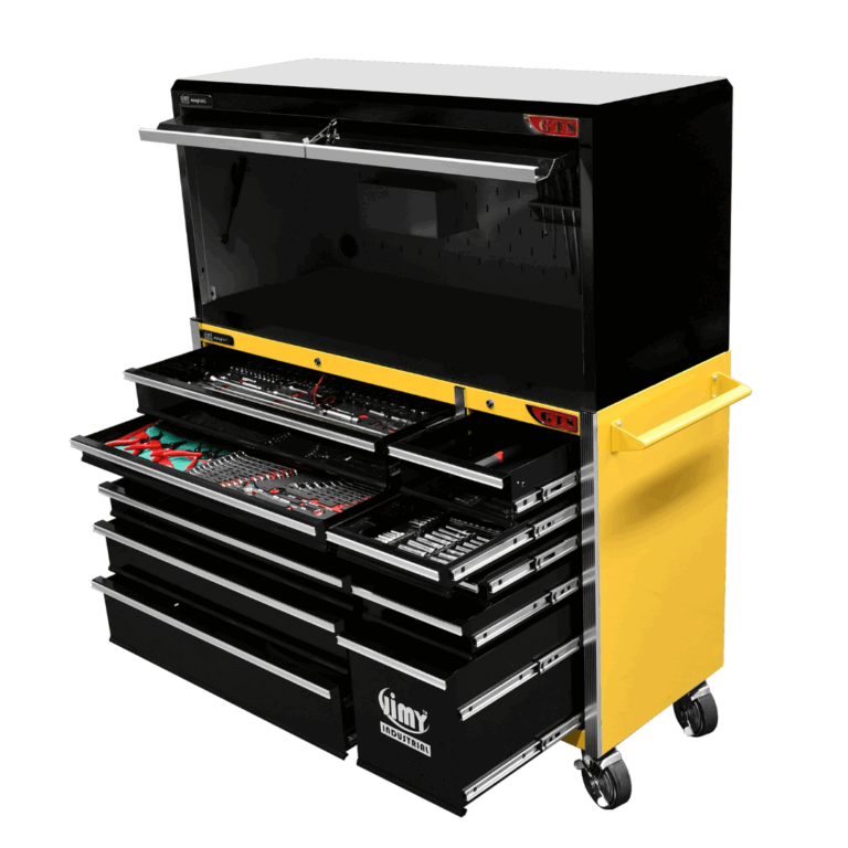 The 11 drawer “Intermediate” hutch tool workshop from Jimy Tools offers a great range of tools for the professional mechanic. The kit consists of a hutch top box and an 11-drawer roller cabinet, all have been powder coated with a tough industrial finish, 1.2mm thick steel, fully lockable with rear internal locking system, dual gas strut system for the hutch and ball bearing slide drawers with twin slides on the deeper drawers.
