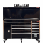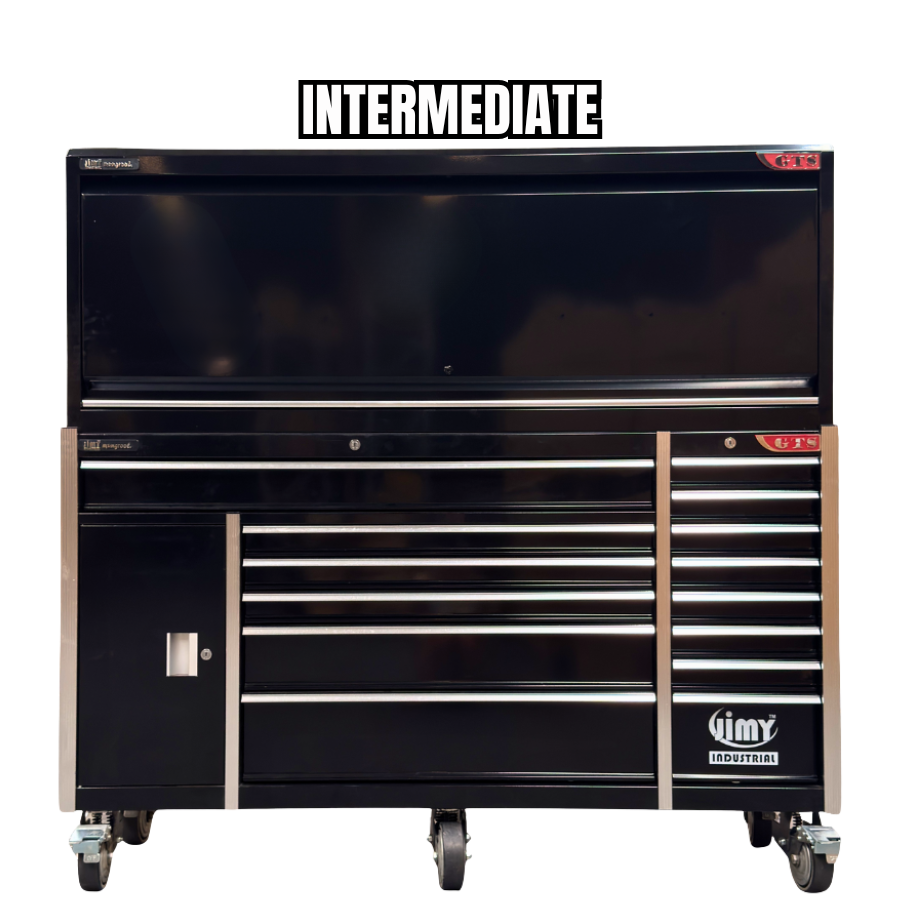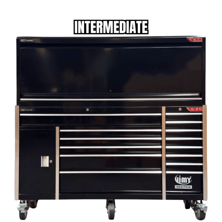 The 14 drawer “Intermediate” hutch tool workshop from Jimy Tools offers a great range of tools for the professional mechanic. The kit consists of a hutch top box and an 11-drawer roller cabinet, all have been powder coated with a tough industrial finish, 1.2mm thick steel, fully lockable with rear internal locking system, dual gas strut system for the hutch and ball bearing slide drawers with twin slides on the deeper drawers.