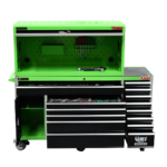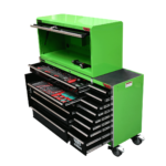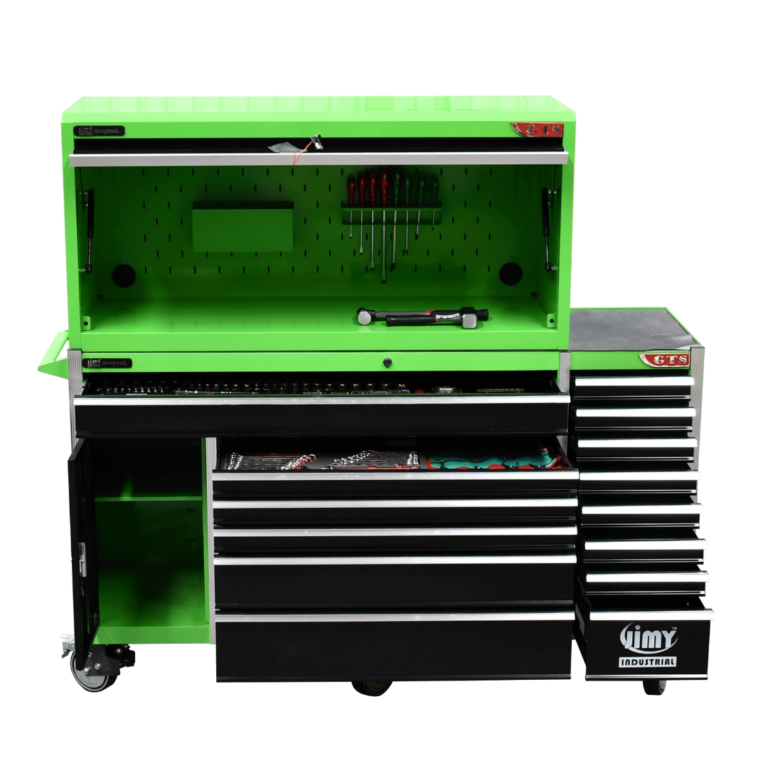 The 14 drawer “Intermediate” hutch tool workshop from Jimy Tools offers a great range of tools for the professional mechanic. The kit consists of a hutch top box and an 11-drawer roller cabinet, all have been powder coated with a tough industrial finish, 1.2mm thick steel, fully lockable with rear internal locking system, dual gas strut system for the hutch and ball bearing slide drawers with twin slides on the deeper drawers.