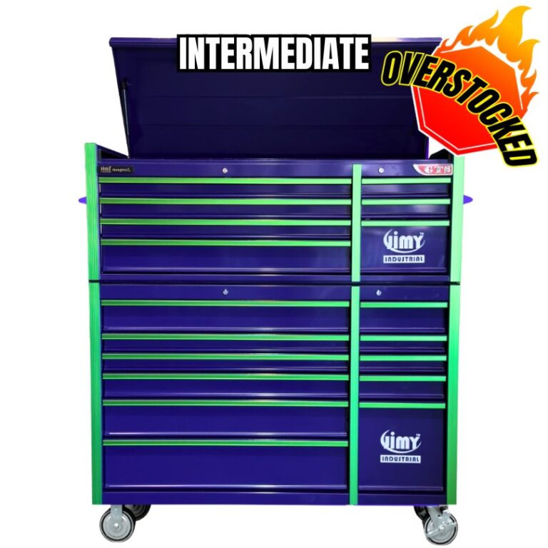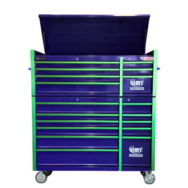 The 18 drawer roller cabinet ‘GTS’ Mechanic’s Tool Kit from Jimy Tools offers a wide range of tools for the trade’s person. The kit consists of a 7 drawer 56” ‘GTS’ tool chest and an 11 drawer 56” ‘GTS’ roller cabinet. Both the tool chest and the roller cabinet have been powder coated with a tough industrial finish and features include 1.2mm thick steel, fully lockable with rear internal locking system and ball bearing slide drawers with twin slides on the deeper drawers. The tool chest also offers a dual gas strut system for the lid.