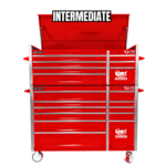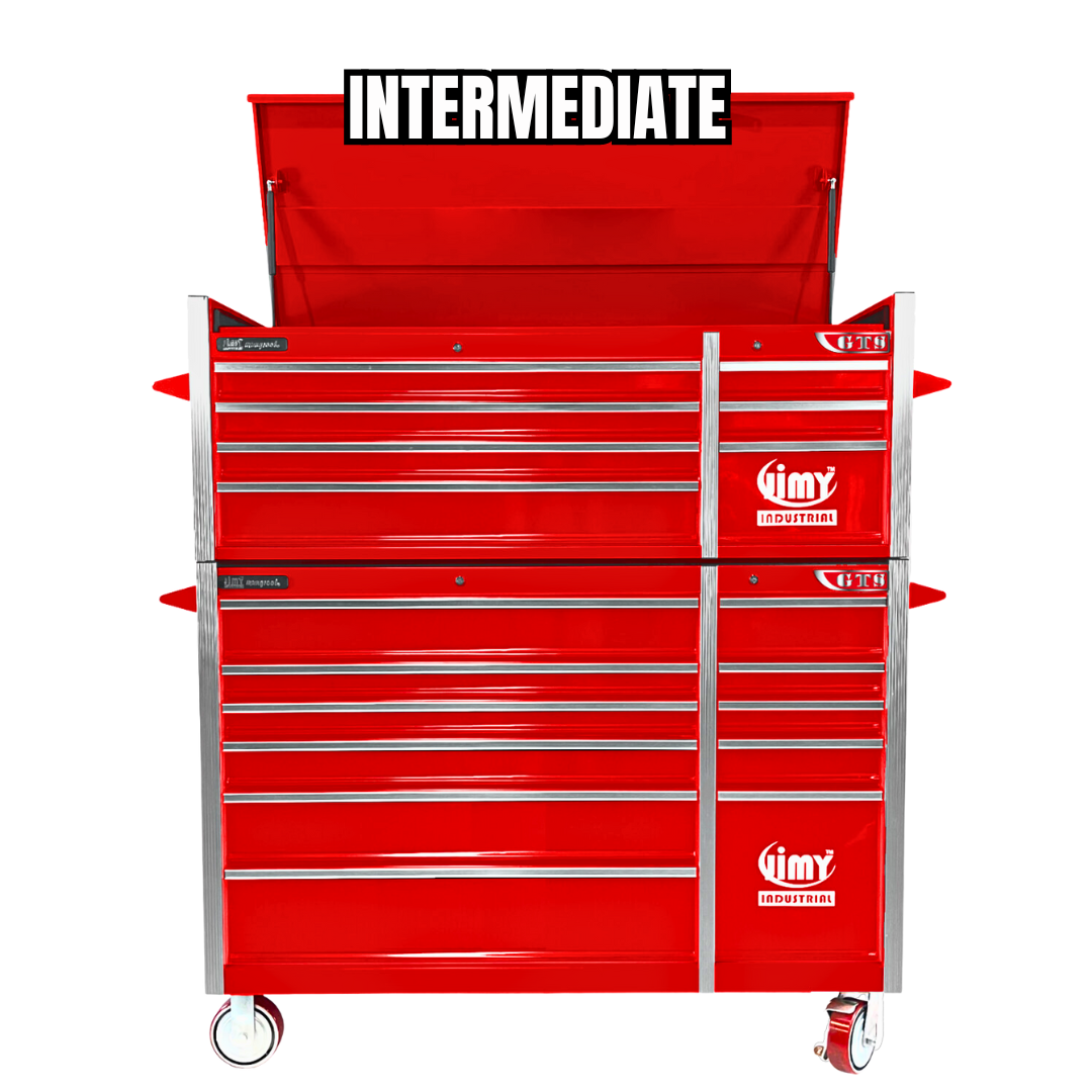 The 18 drawer roller cabinet ‘GTS’ Mechanic’s Tool Kit from Jimy Tools offers a wide range of tools for the trade’s person. The kit consists of a 7 drawer 56” ‘GTS’ tool chest and an 11 drawer 56” ‘GTS’ roller cabinet. Both the tool chest and the roller cabinet have been powder coated with a tough industrial finish and features include 1.2mm thick steel, fully lockable with rear internal locking system and ball bearing slide drawers with twin slides on the deeper drawers. The tool chest also offers a dual gas strut system for the lid.