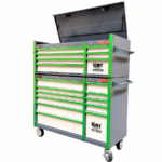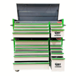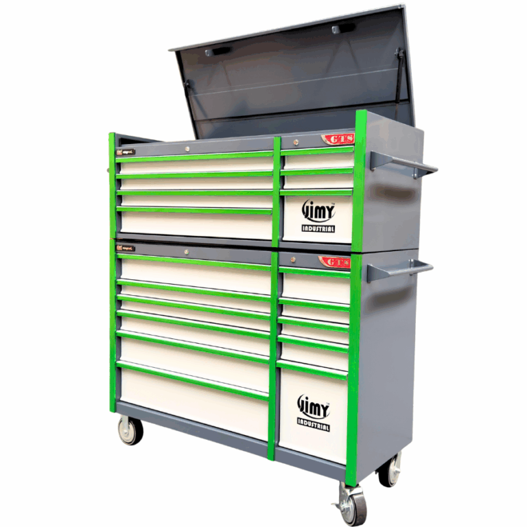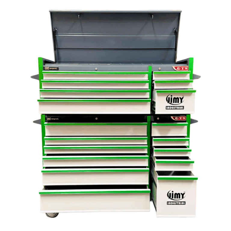 The 18 drawer roller cabinet ‘GTS’ Mechanic’s Tool Kit from Jimy Tools offers a wide range of tools for the trade’s person. The kit consists of a 7 drawer 56” ‘GTS’ tool chest and an 11 drawer 56” ‘GTS’ roller cabinet. Both the tool chest and the roller cabinet have been powder coated with a tough industrial finish and features include 1.2mm thick steel, fully lockable with rear internal locking system and ball bearing slide drawers with twin slides on the deeper drawers. The tool chest also offers a dual gas strut system for the lid.