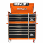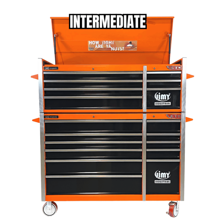 The 18 drawer roller cabinet ‘GTS’ Mechanic’s Tool Kit from Jimy Tools offers a wide range of tools for the trade’s person. The kit consists of a 7 drawer 56” ‘GTS’ tool chest and an 11 drawer 56” ‘GTS’ roller cabinet. Both the tool chest and the roller cabinet have been powder coated with a tough industrial finish and features include 1.2mm thick steel, fully lockable with rear internal locking system and ball bearing slide drawers with twin slides on the deeper drawers. The tool chest also offers a dual gas strut system for the lid.