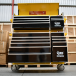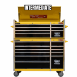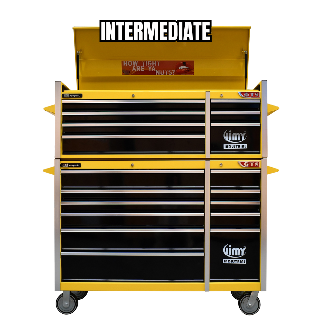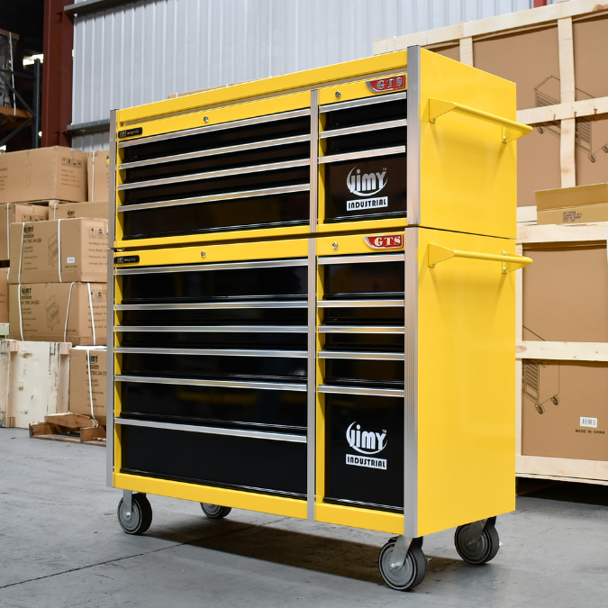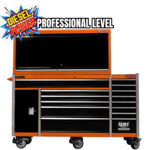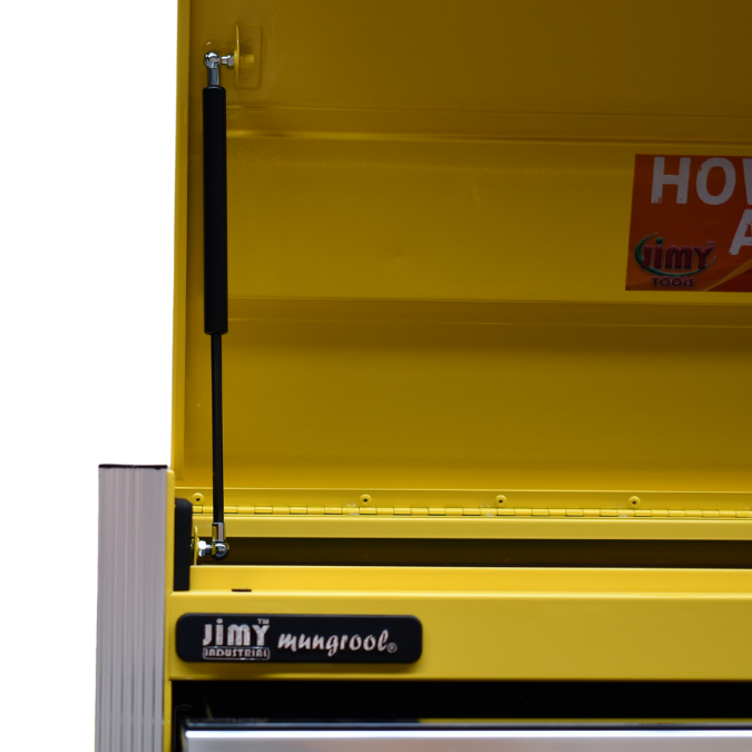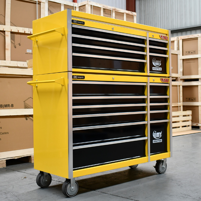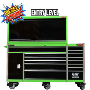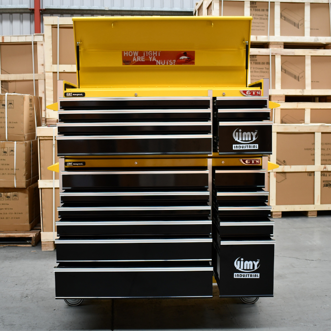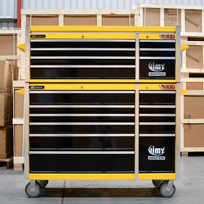 The 18 drawer roller cabinet ‘GTS’ Mechanic’s Tool Kit from Jimy Tools offers a wide range of tools for the trade’s person. The kit consists of a 7 drawer 56” ‘GTS’ tool chest and an 11 drawer 56” ‘GTS’ roller cabinet. Both the tool chest and the roller cabinet have been powder coated with a tough industrial finish and features include 1.2mm thick steel, fully lockable with rear internal locking system and ball bearing slide drawers with twin slides on the deeper drawers. The tool chest also offers a dual gas strut system for the lid.